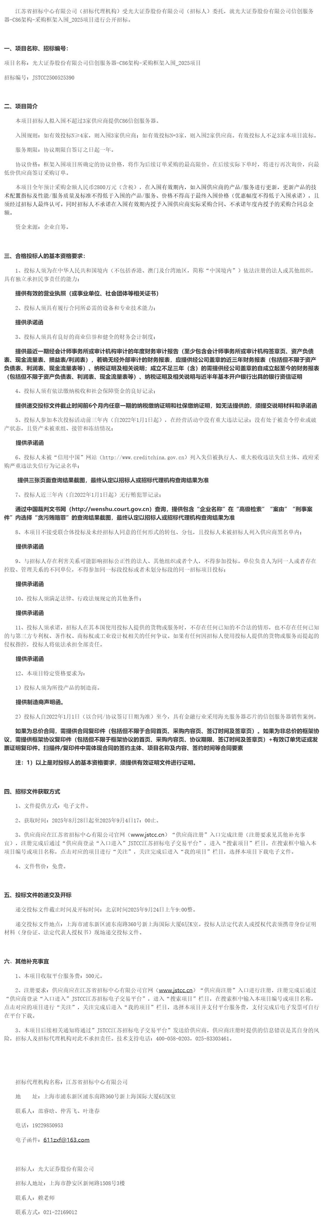 光大证券股份有限公司信创服务器****架构*采购框架入围*****项目招标公告