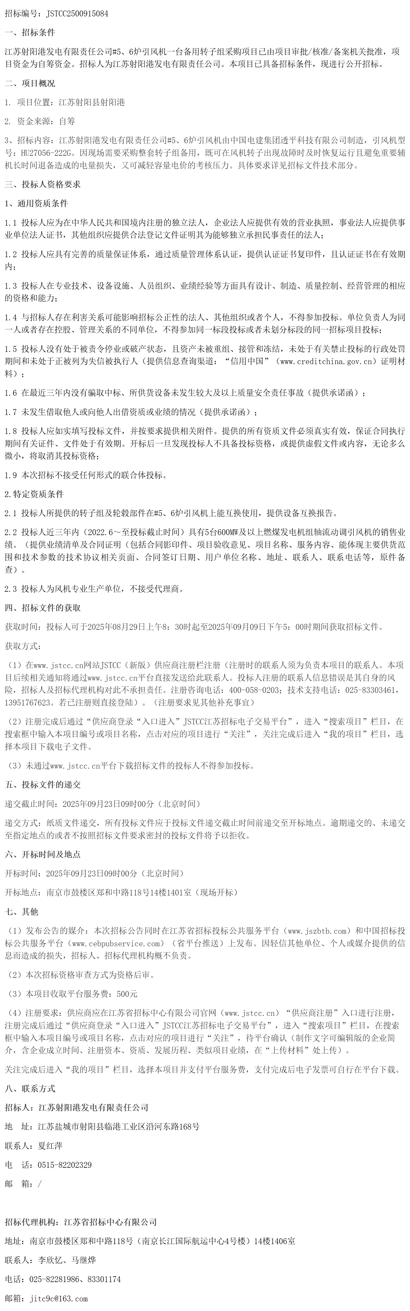 江苏射阳港发电有限责任公司#*、*炉引风机一台备用转子组采购项目招标公告