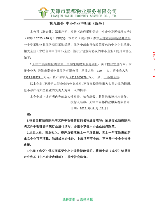受天津市滨海新区塘沽第一中学委托,天津市滨海新区政府采购中心以公开招标方式,对天津市滨海新区塘沽第一中学采购物业服务项目实施采购,现将中标结果公布如下: 一、项目名称和编号 *.项目名称:天津市滨海新区塘沽第一中学采购物业服务项目 *.项目编号:**************** 二、中标信息 *.中标供应商名称:天津市泰都物业服务有限公司 *.中标供应商地址:津南区赤龙街联东优谷产业园******** *.供应商评审报价、评审总得分及排序情况:见附件 *.主要中标标的名称、规格型号、数量、单价、服务要求或者标的基本概况:物业管理服务 三、评标委员会成员名单 马琨、吴虹、张立青、尹玉华、马葳(采购人代表) 四、项目联系人及联系方式 *.联系人:肖琳 *.联系方式:************ 五、采购人的名称、地址和联系方式 *.采购人名称:天津市滨海新区塘沽第一中学 *.采购人地址:天津市滨海新区塘沽烟台道三号 *.采购人联系电话:王大利,************ 六、采购代理机构的名称、地址和联系方式 *.采购代理机构名称:天津市滨海新区政府采购中心 *.采购代理机构地址:天津市滨海新区营口道***号 *.采购代理机构联系方式:************ 七、质疑方式 参与本项目政府采购活动的供应商认为中标结果使自己的合法权益受到损害的,可以在中标结果公告期限届满之日起*个工作日内,以书面形式向采购人和天津市滨海新区政府采购中心提出质疑,逾期不予受理。 八、本项目不向中标供应商收取服务费。 九、中标结果公告期限 中标结果的公告期限为*个工作日。 十、招标文件公告:见附件