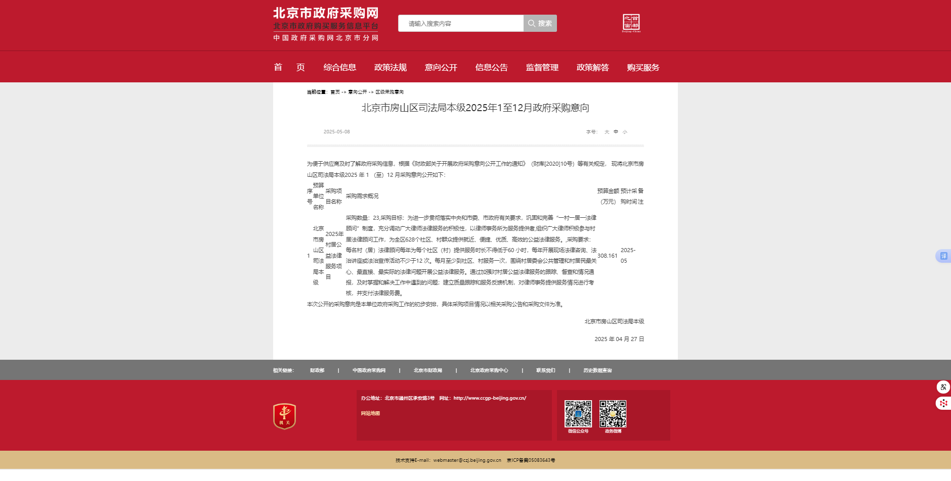 采购内容:本项目采购内容为房山区司法局****年村居公益法律服务,具体指房山区司法局与项目成交的律师事务所签订《采购合同》后,由律师事务所派遣律师每个月到签约社区、村开展村居公益法律服务,围绕村居委员会公共管理和村居民最关心、最直接、最实际的法律问题(简称“顾讲询调训”)开展公益法律服务。本项目服务期为*年,为了保证服务质量,每个律所最终中标分包不得超过三个分包,成交律所为签约的村、社区指派服务的律师应当在签约时不满**周岁、具备相应的身体条件,每个律师最多只能为*个社区、村提供法律服务。具体内容详见磋商文件采购需求。