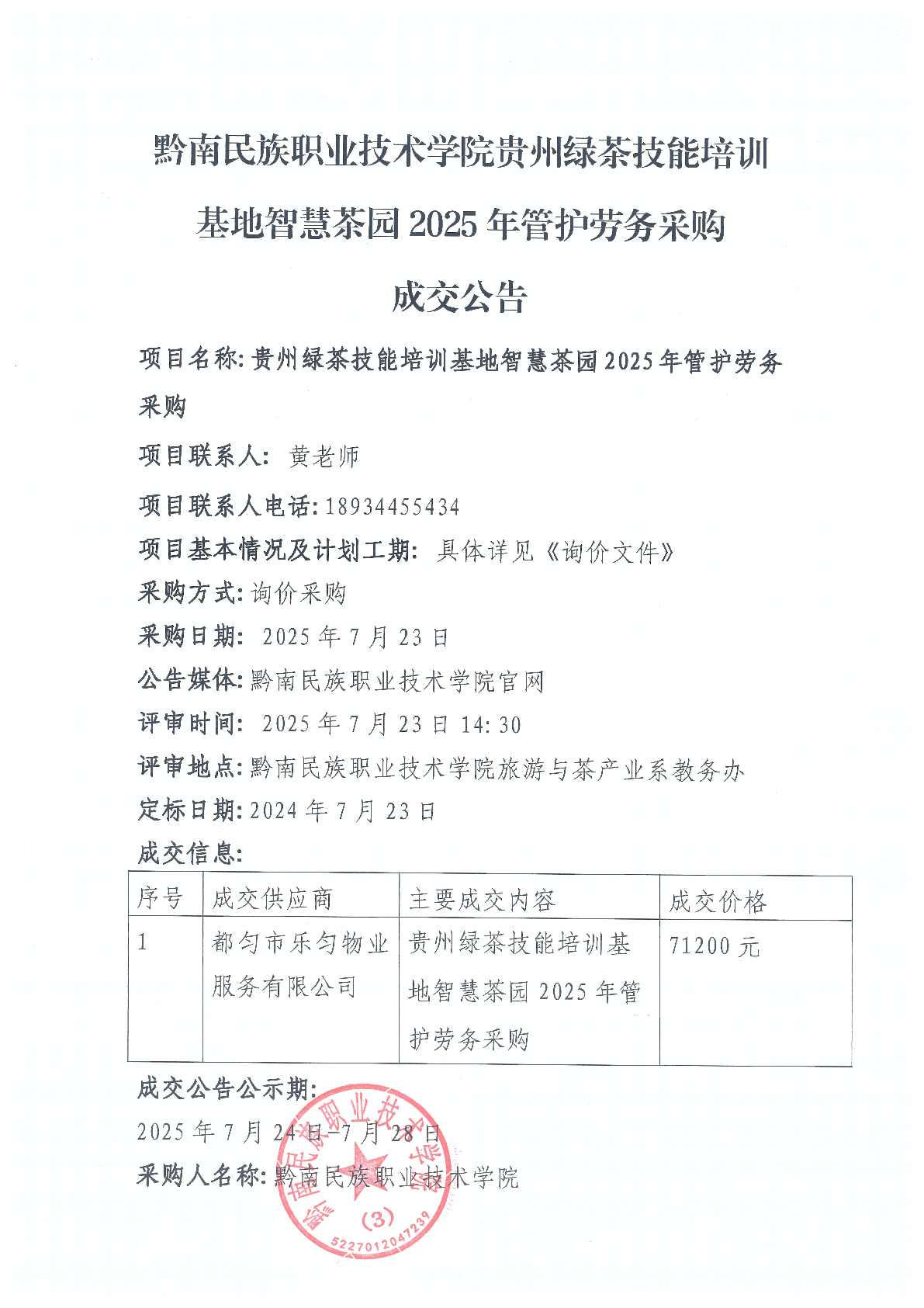 贵州绿茶技能培训基地智慧茶园2025年管护劳务采购成交公告