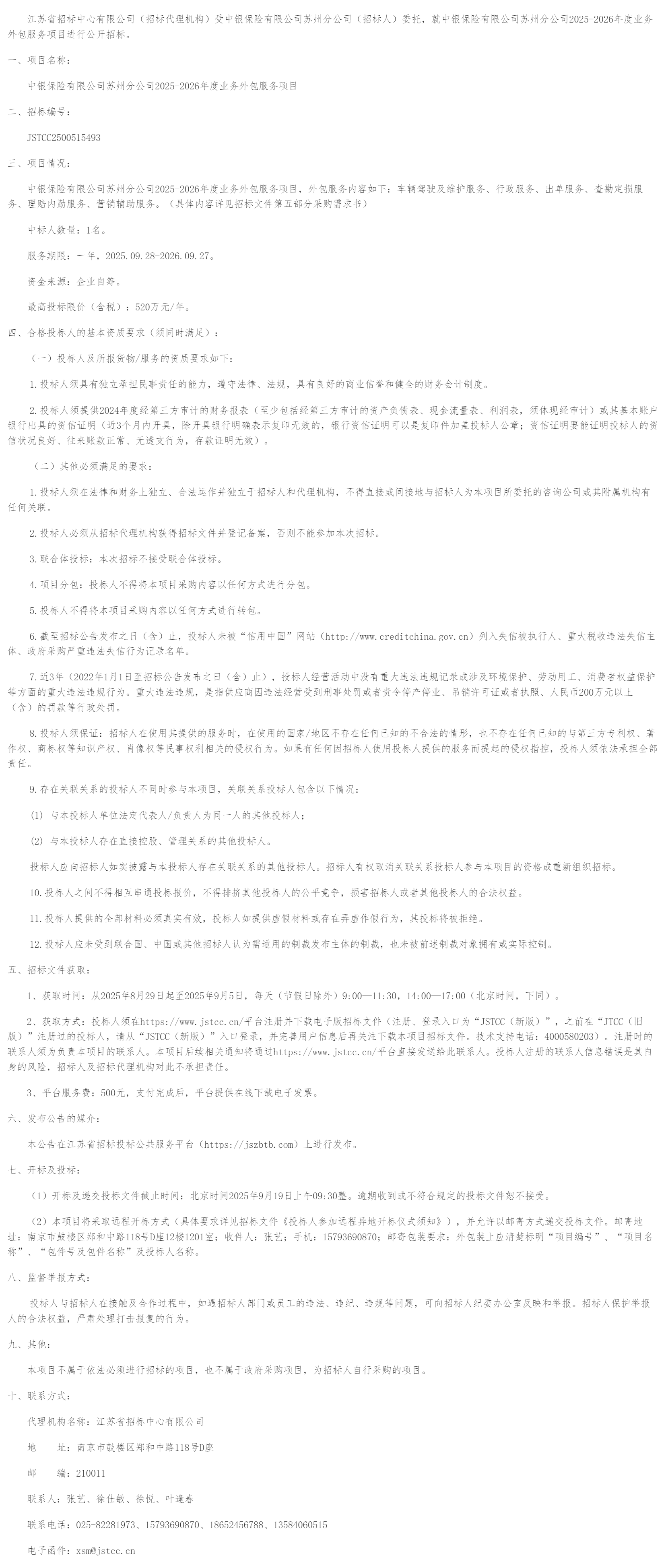 江苏省招标中心有限公司(招标代理机构)受中银保险有限公司苏州分公司(招标人)委托,就中银保险有限公司苏州分公司*********年度业务外包服务项目进行公开招标。