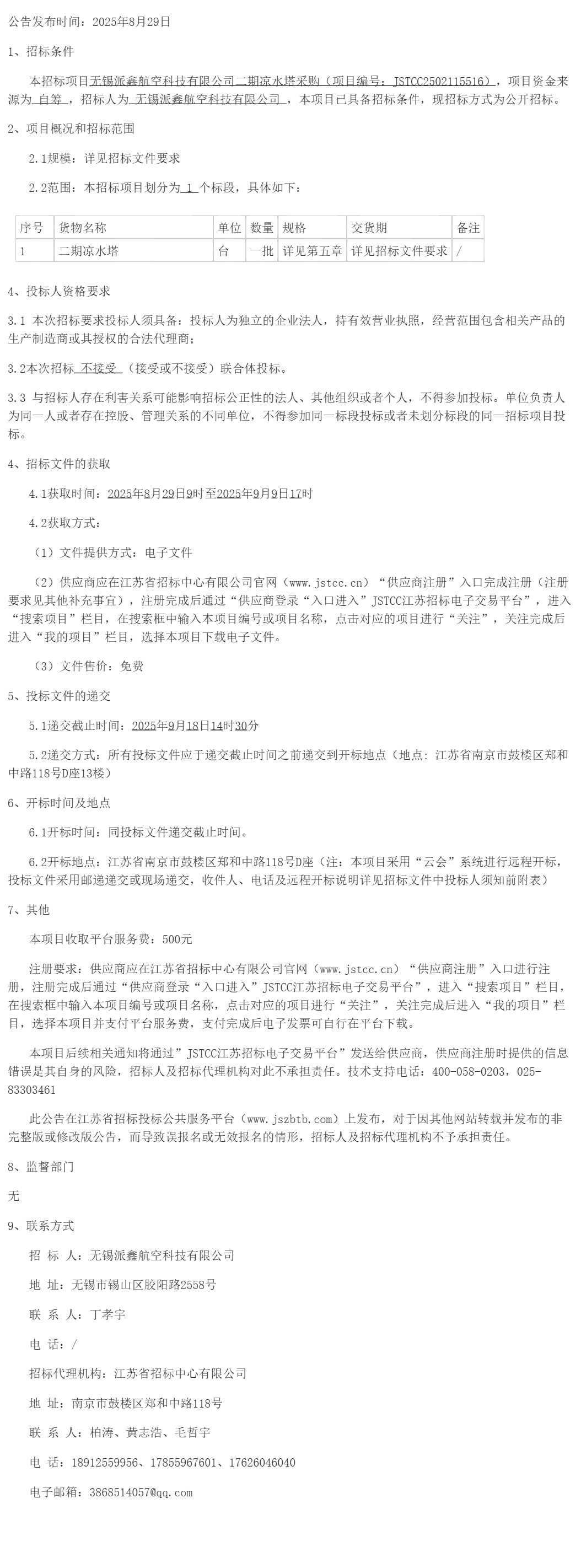 无锡派鑫航空科技有限公司二期凉水塔采购招标公告