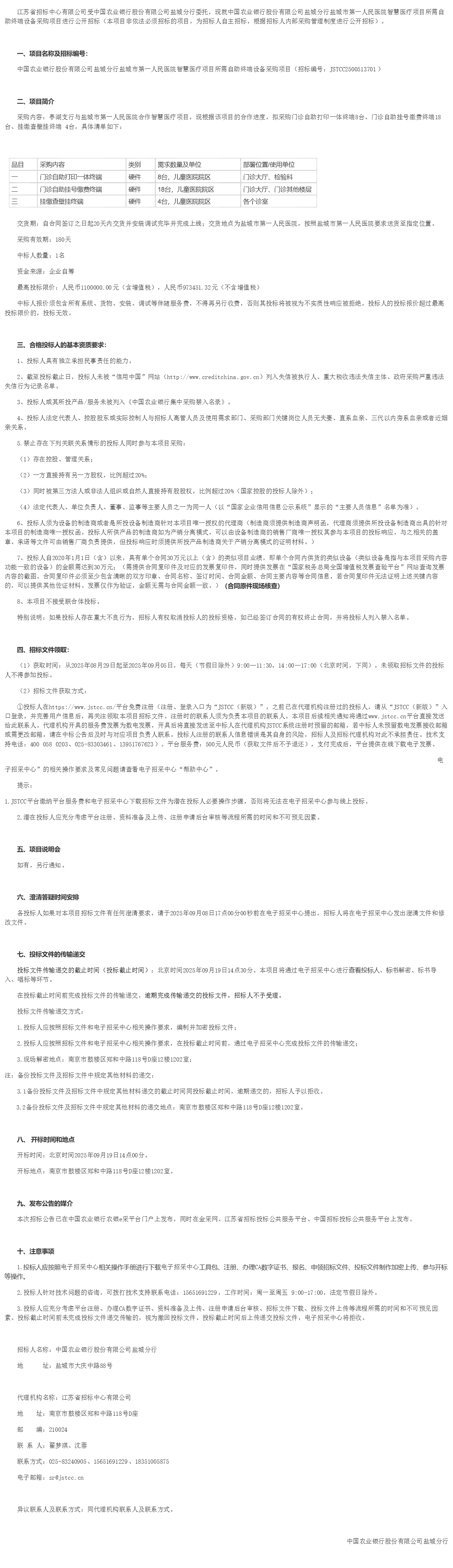 江苏省招标中心有限公司受中国农业银行股份有限公司盐城分行委托,现就中国农业银行股份有限公司盐城分行盐城市第一人民医院智慧医疗项目所需自助终端设备采购项目进行公开招标(本项目非依法必须招标的项目,为招标人自主招标,根据招标人内部采购管理制度进行公开招标)。