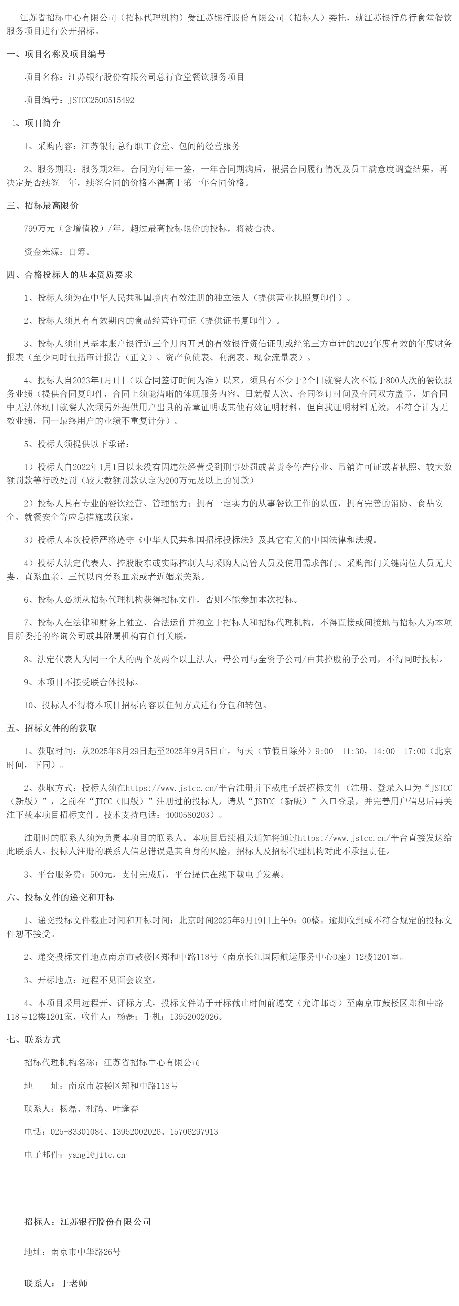 江苏省招标中心有限公司(招标代理机构)受江苏银行股份有限公司(招标人)委托,就江苏银行总行食堂餐饮服务项目进行公开招标。