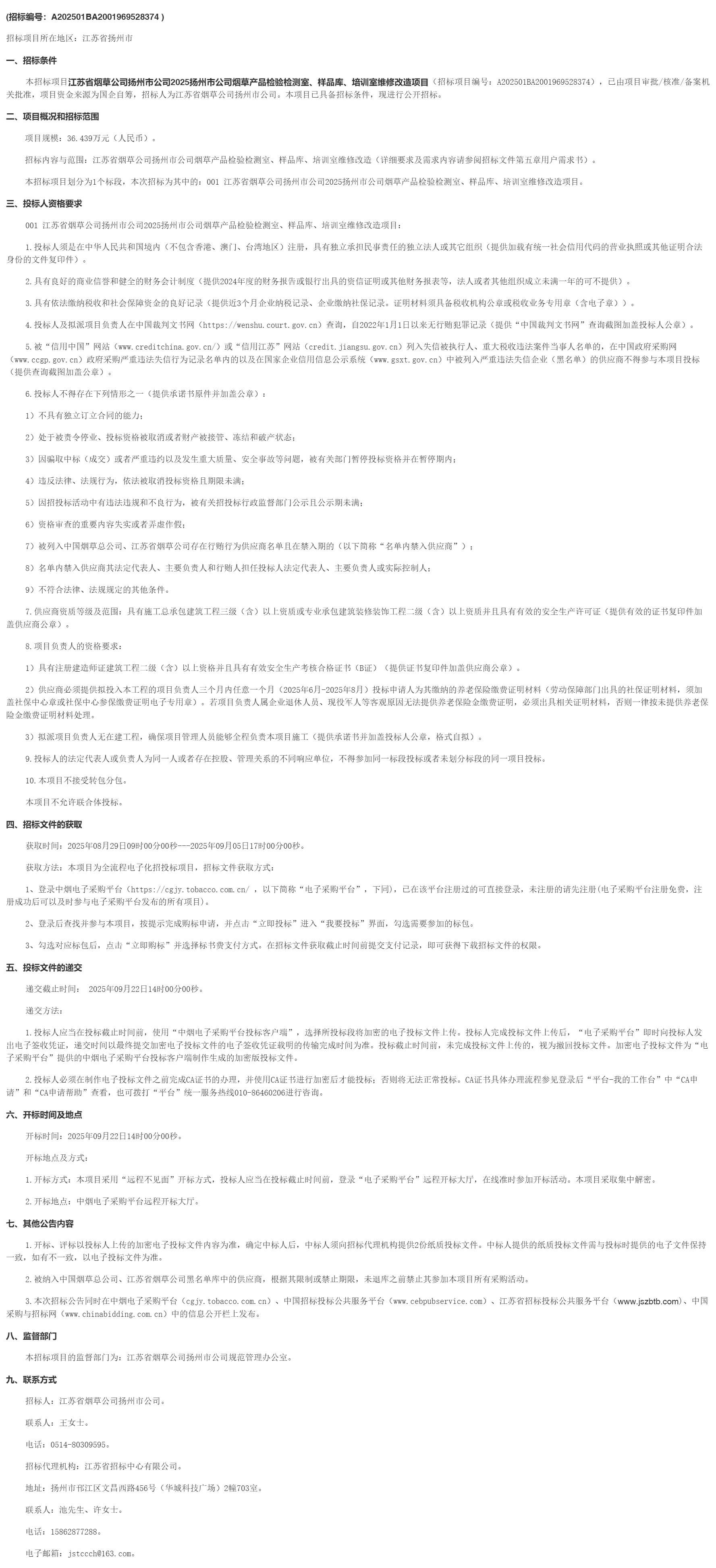 江苏省烟草公司扬州市公司****扬州市公司烟草产品检验检测室、样品库、培训室维修改造项目招标公告