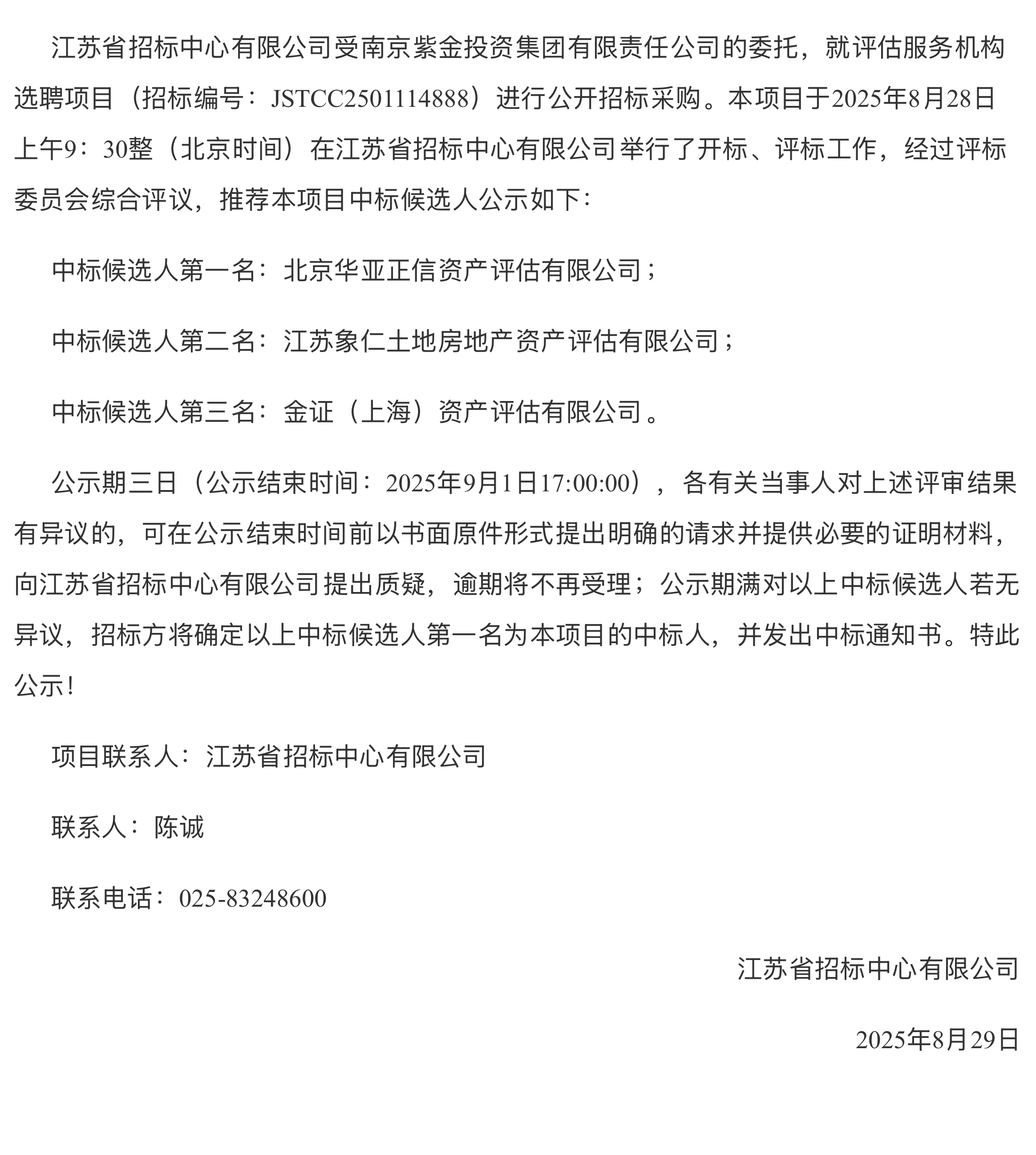 南京紫金投资集团有限责任公司评估服务机构选聘项目中标候选人公示