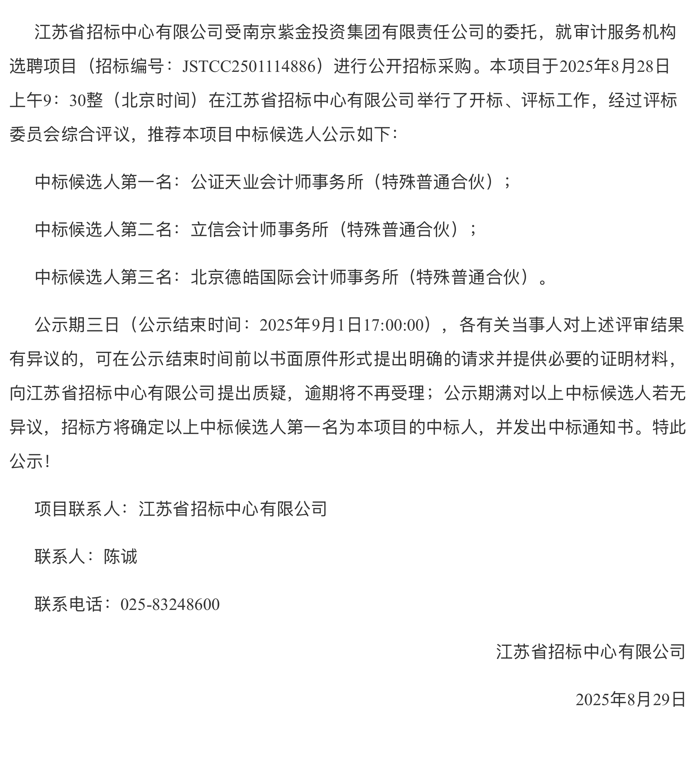 南京紫金投资集团有限责任公司审计服务机构选聘项目中标候选人公示