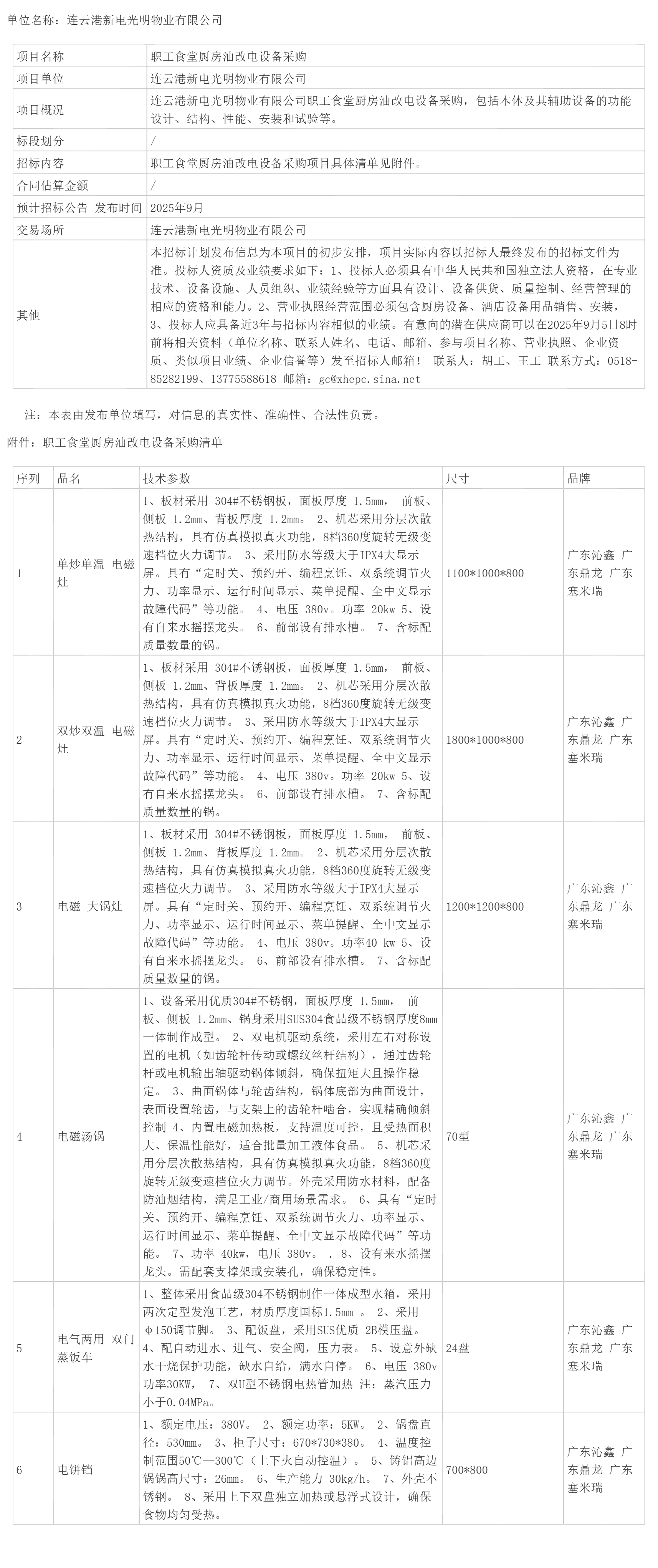 | 项目概况 | 连云港新电光明物业有限公司职工食堂厨房油改电设备采购,包括本体及其辅助设备的功能设计、结构、性能、安装和试验等。 |