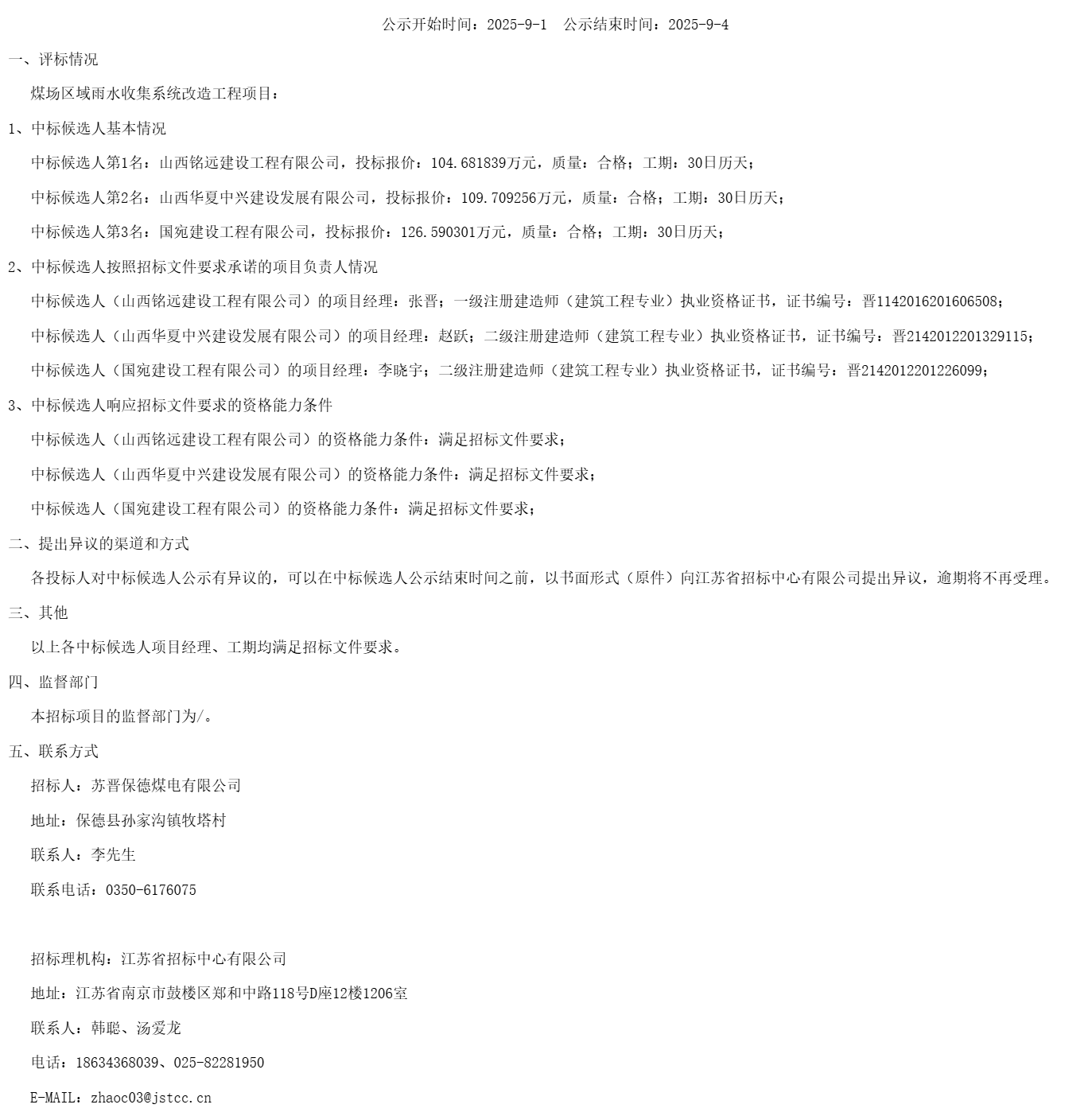 苏晋保德煤电有限公司煤场区域雨水收集系统改造工程项目中标候选人公示(*************** )
