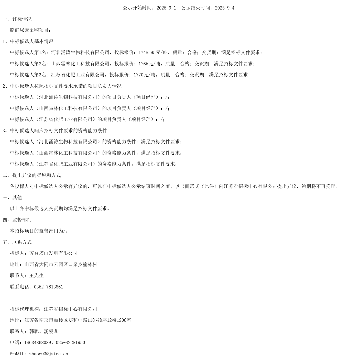 苏晋塔山发电有限公司脱硝尿素采购项目中标候选人公示(***************)