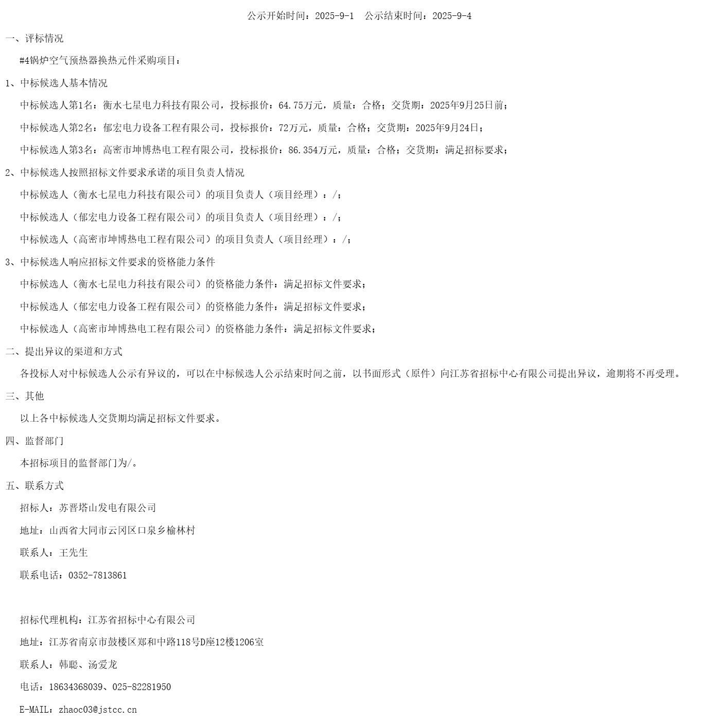 苏晋塔山发电有限公司#*锅炉空气预热器换热元件采购项目中标候选人公示(***************)