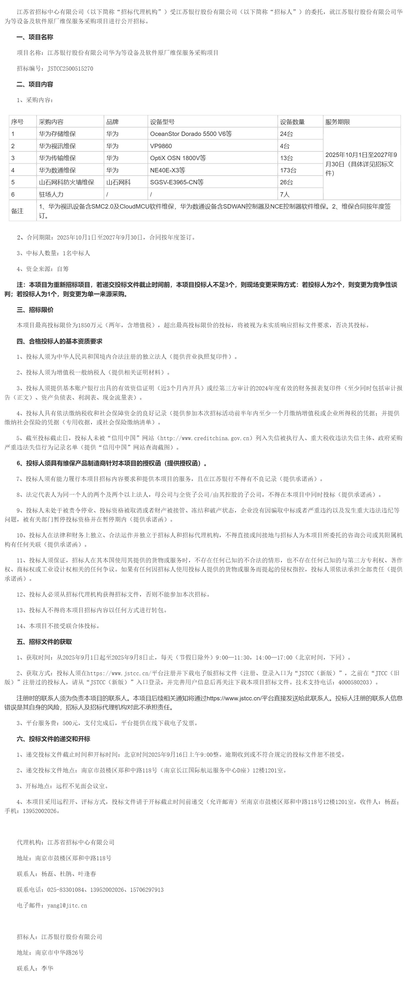 江苏省招标中心有限公司(以下简称“招标代理机构”)受江苏银行股份有限公司(以下简称“招标人”)的委托,就江苏银行股份有限公司华为等设备及软件原厂维保服务采购项目进行公开招标。