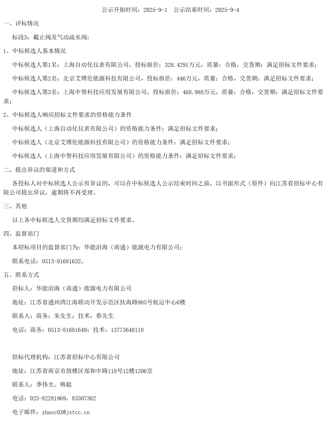 华能南通(通州湾)2×100万千瓦大型清洁高效煤电项目第五批辅机设备(第二批次)标段3:截止阀及气动疏水阀中标候选人公示(JSTCC2500313884-3)