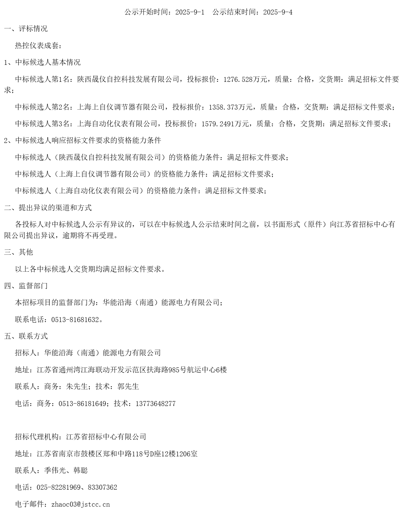 华能南通(通州湾)2×100万千瓦大型清洁高效煤电项目热控仪表成套中标候选人公示(JSTCC2500314391)