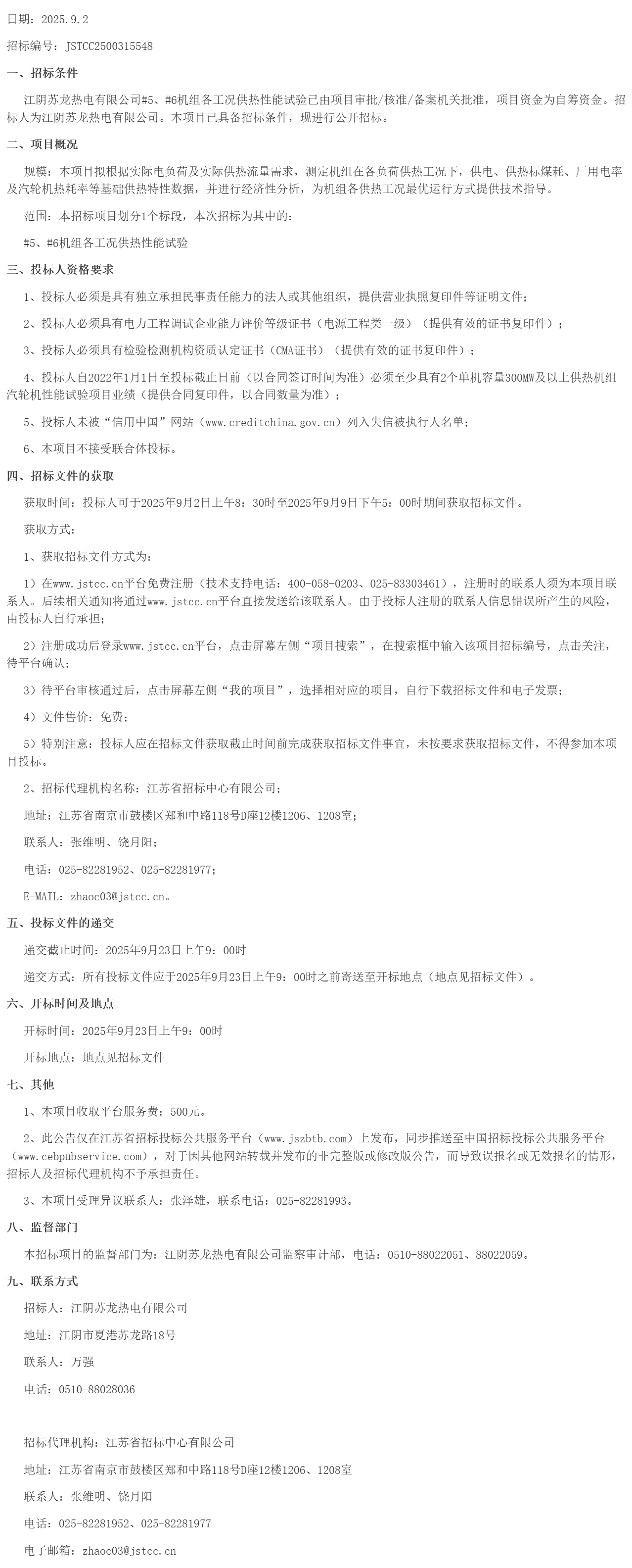 江阴苏龙热电有限公司#*、#*机组各工况供热性能试验招标公告(***************)