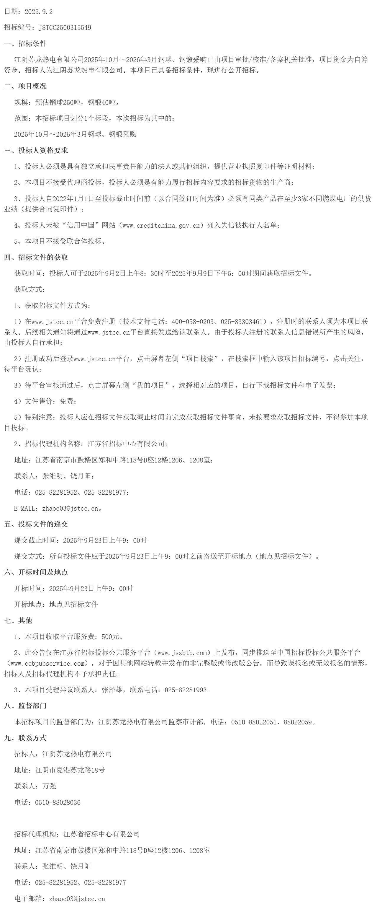 江阴苏龙热电有限公司****年**月~****年*月钢球、钢锻采购招标公告(***************)