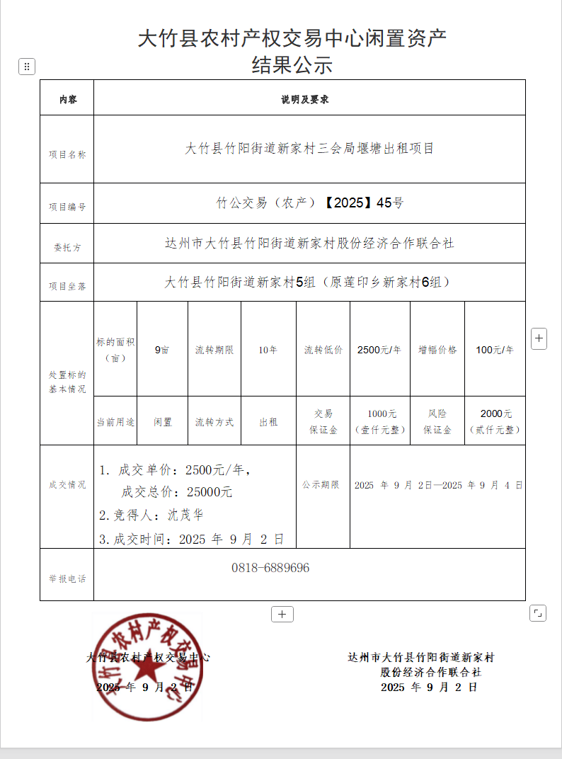 大竹县竹阳街道新家村三会局堰塘出租项目结果公示