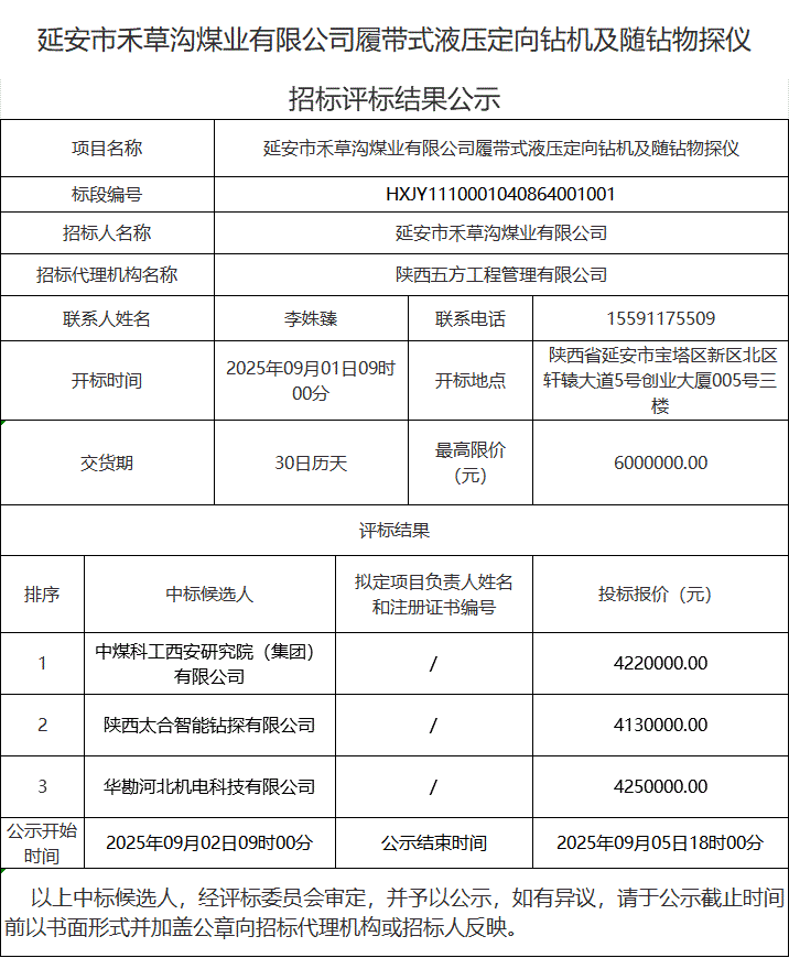 延安市禾草沟煤业有限公司履带式液压定向钻机及随钻物探仪中标候选人公示