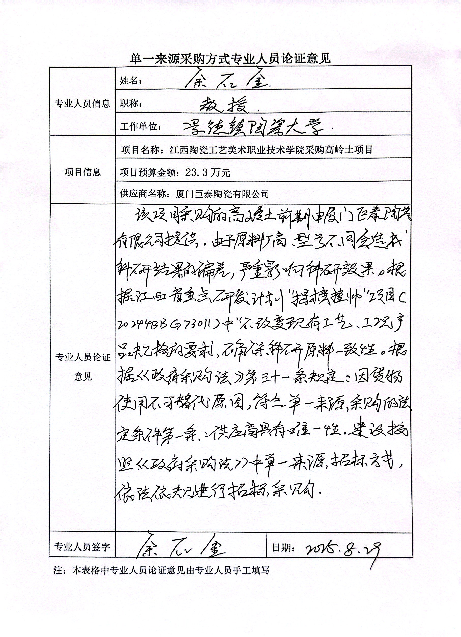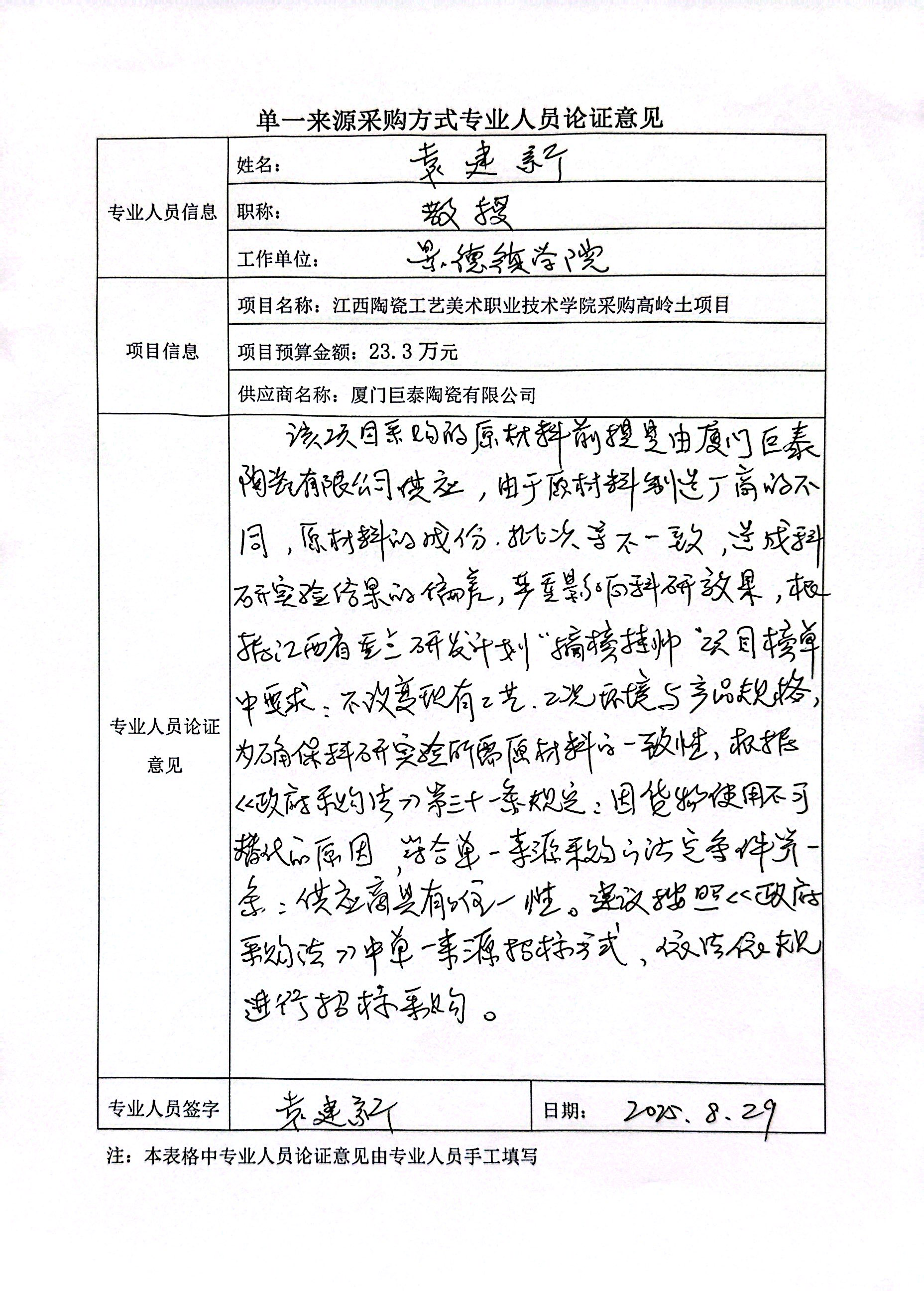 采用单一来源采购方式的原因及说明:该项目采购的高岭土前期由厦门巨泰陶瓷有限公司提供,由于原料厂商型号不同会造成科研结果的偏差,严重影响科研效果,为确保科研效果的稳定性,故采用单一来源采购方式采购。