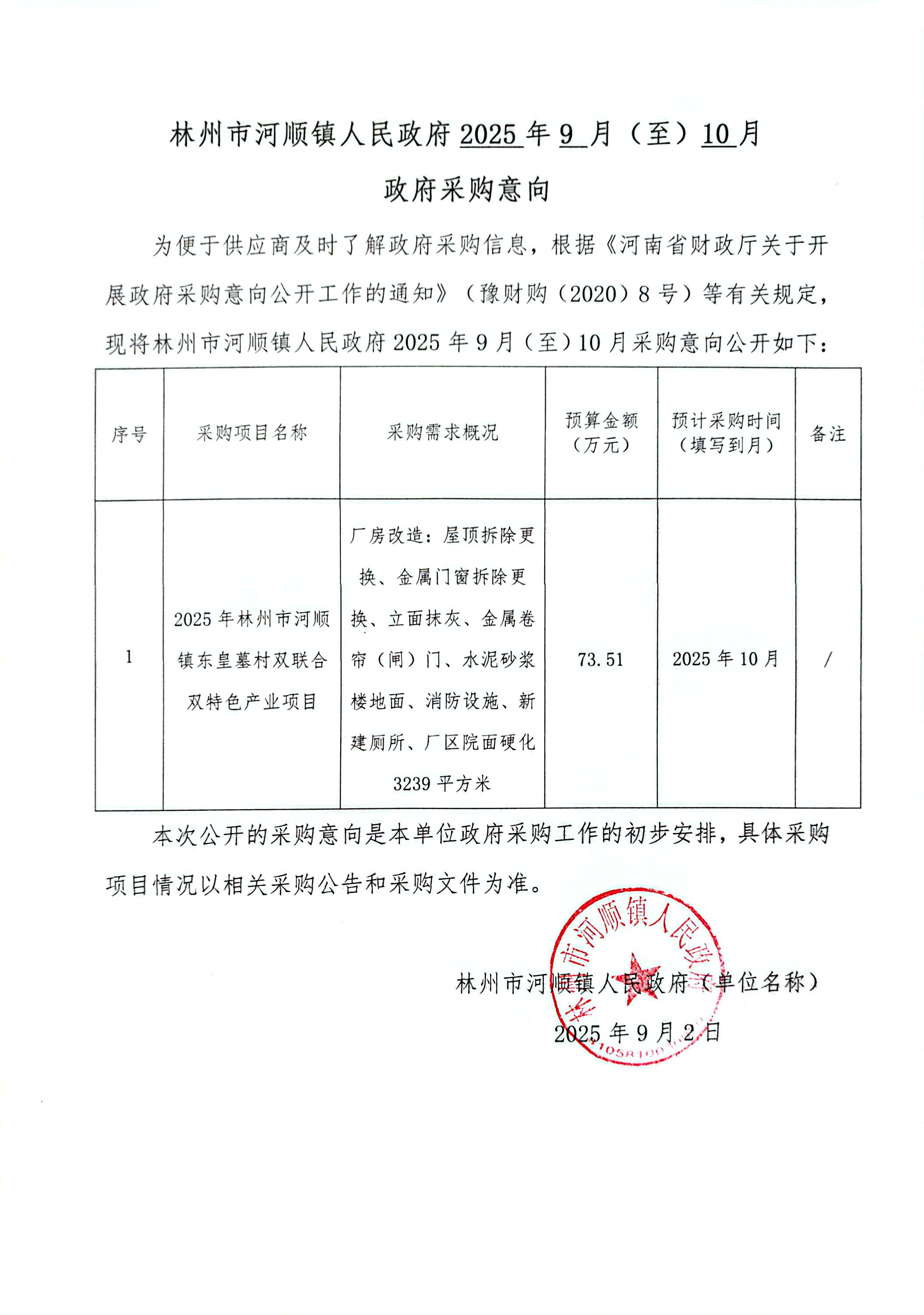 林州市河顺镇人民政府2025年9至10月政府采购意向