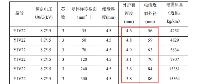 *.第*页*.*条对外护套的描述:厚度完全符合 **/* *****.* 的规定。而第*页*.**条交联聚乙烯绝缘电力电缆技术数据中*****、*****、*****电缆外护套厚度大于******外护套厚度。问题:*****、*****、*****电缆外护套厚度大于******外护套厚度,且与**/******.*假设计算值不符。且电缆近似外径与电缆质量与依据**/******.******计算的理论值相差较大。