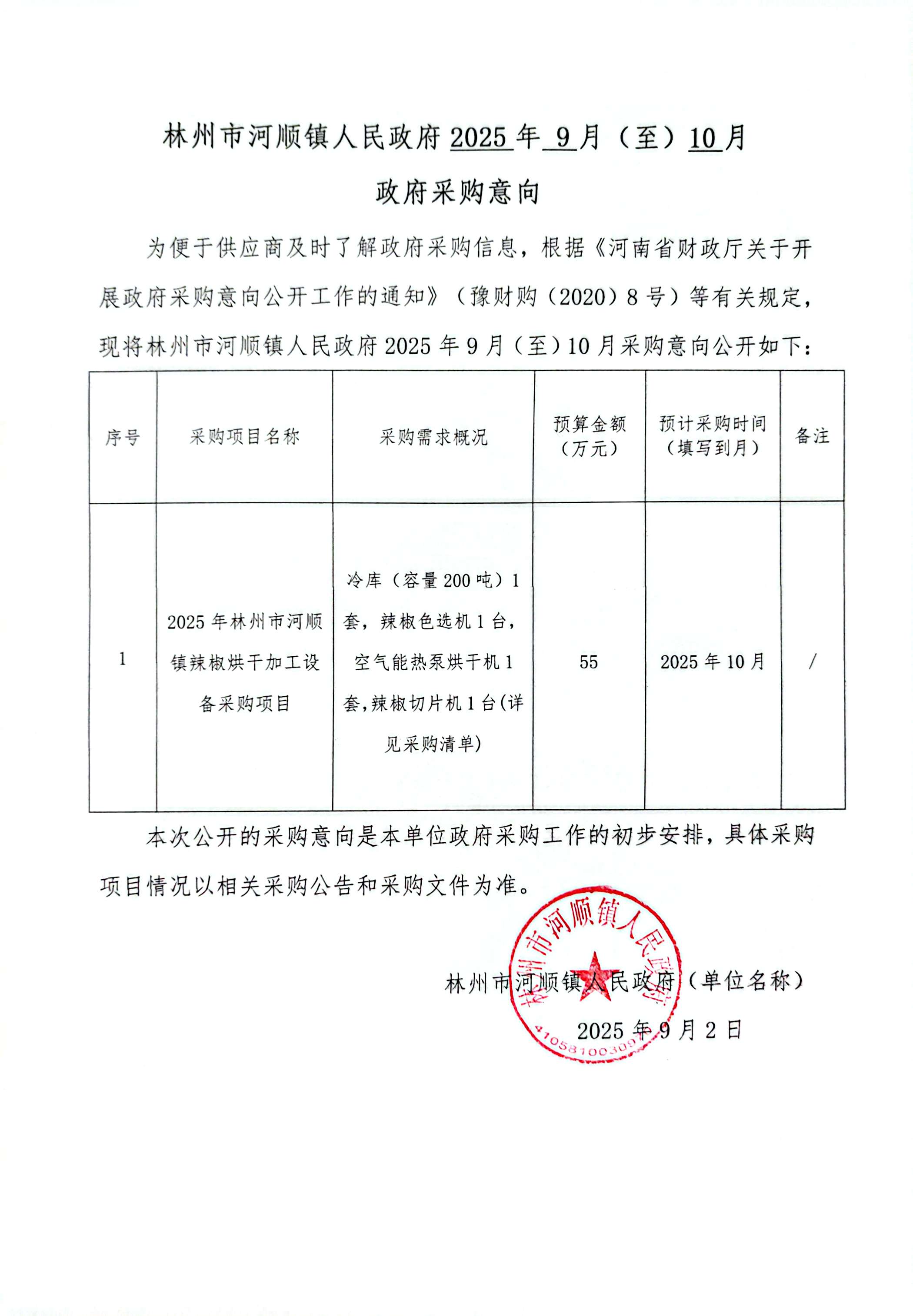 林州市河顺镇人民政府2025年9至10月政府采购意向