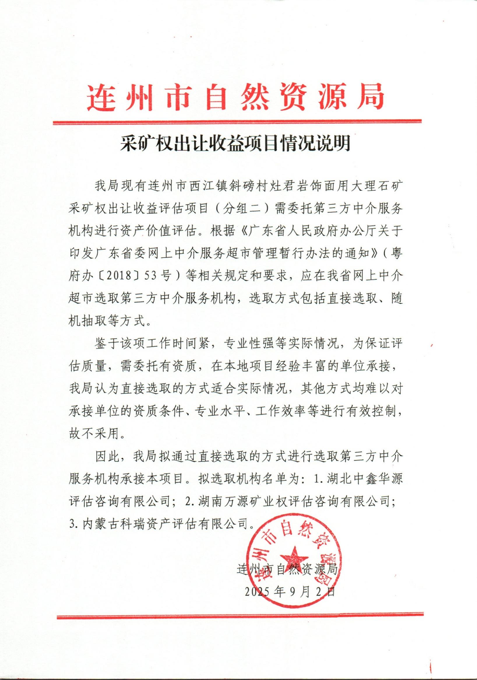 我局现有连州市西江镇斜磅村灶君岩饰面用大理石矿采矿权出让收益评估项目(分组二)需委托第三方中介服务机构进行资产价值评估。根据《广东省人民政府办公厅关于印发广东省委网上中介服务超市管理暂行办法的通知》(粤府办〔****〕**号)等相关规定和要求,应在我省网上中介超市选取第三方中介服务机构,选取方式包括直接选取、随机抽取等方式。鉴于该项工作时间紧,专业性强等实际情况,为保证评估质量,需委托有资质,在本地项目经验丰富的单位承接,我局认为直接选取的方式适合实际情况,其他方式均难以对承接单位的资质条件、专业水平、工作效率等进行有效控制,故不采用。因此,我局拟通过直接选取的方式进行选取第三方中介服务机构承接本项目。拟选取机构名单为:*.湖北中鑫华源评估咨询有限公司;*.湖南万源矿业权评估咨询有限公司;*.内蒙古科瑞资产评估有限公司。