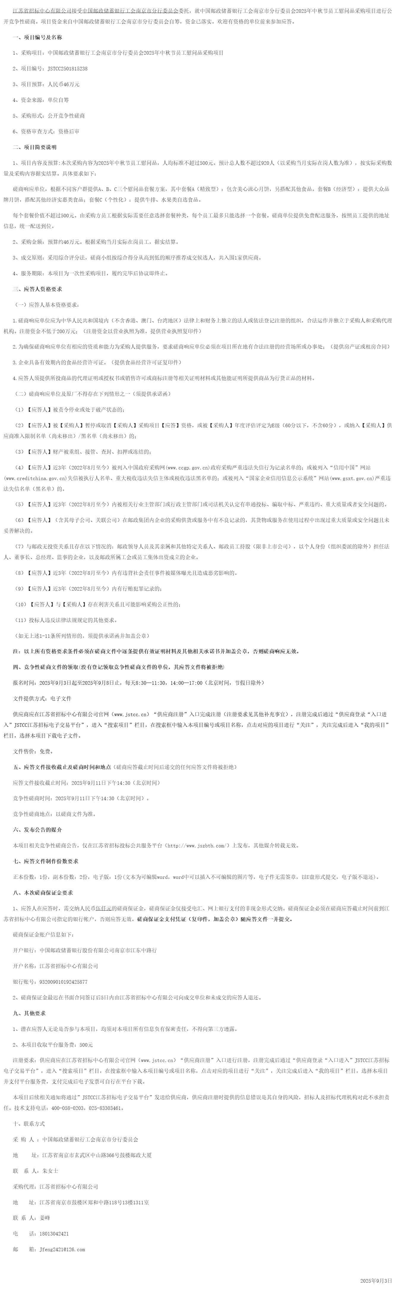 中国邮政储蓄银行工会南京市分行委员会****年中秋节员工慰问品采购项目竞争性磋商公告
