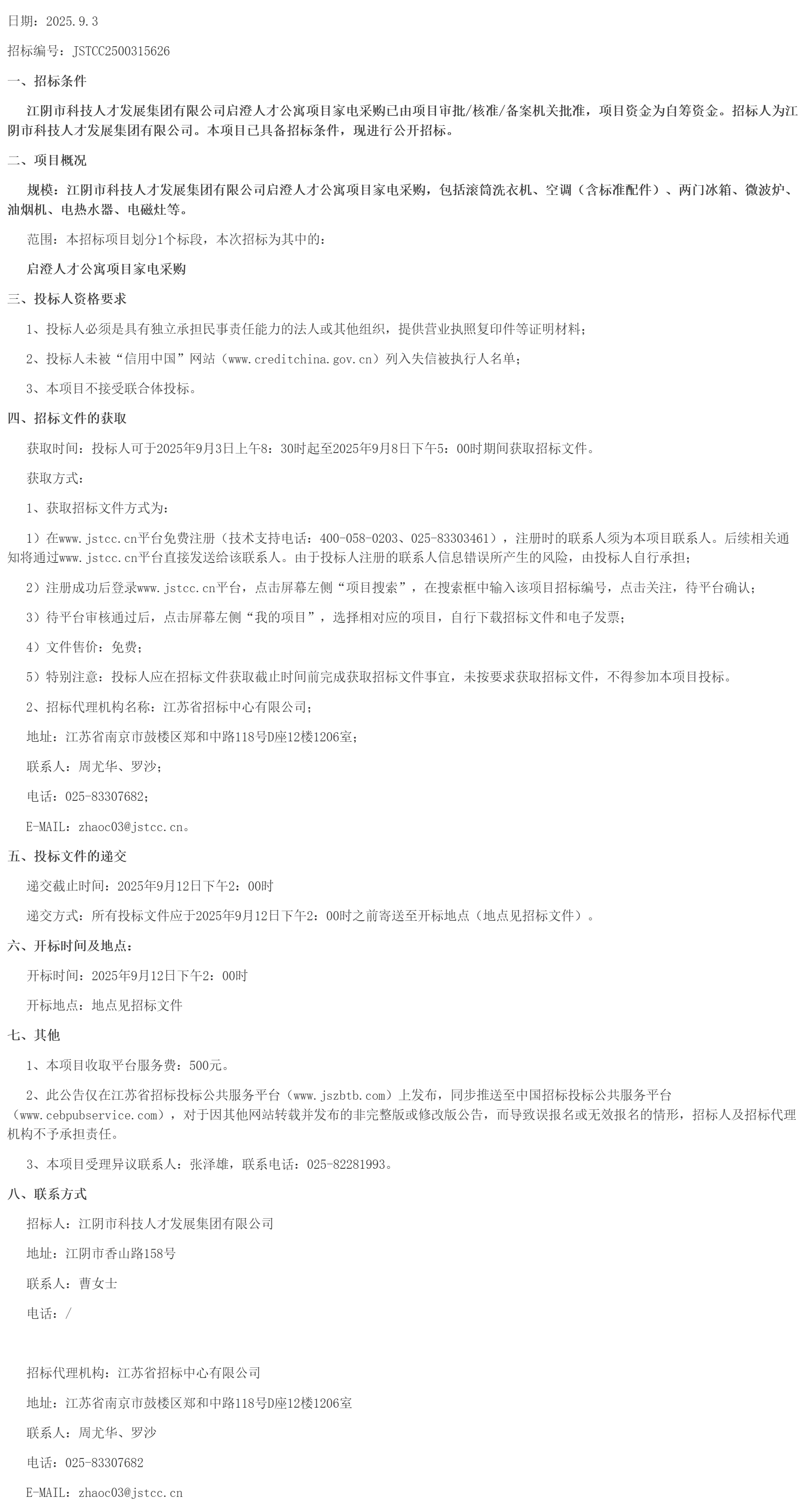 江阴市科技人才发展集团有限公司启澄人才公寓项目家电采购招标公告(***************)