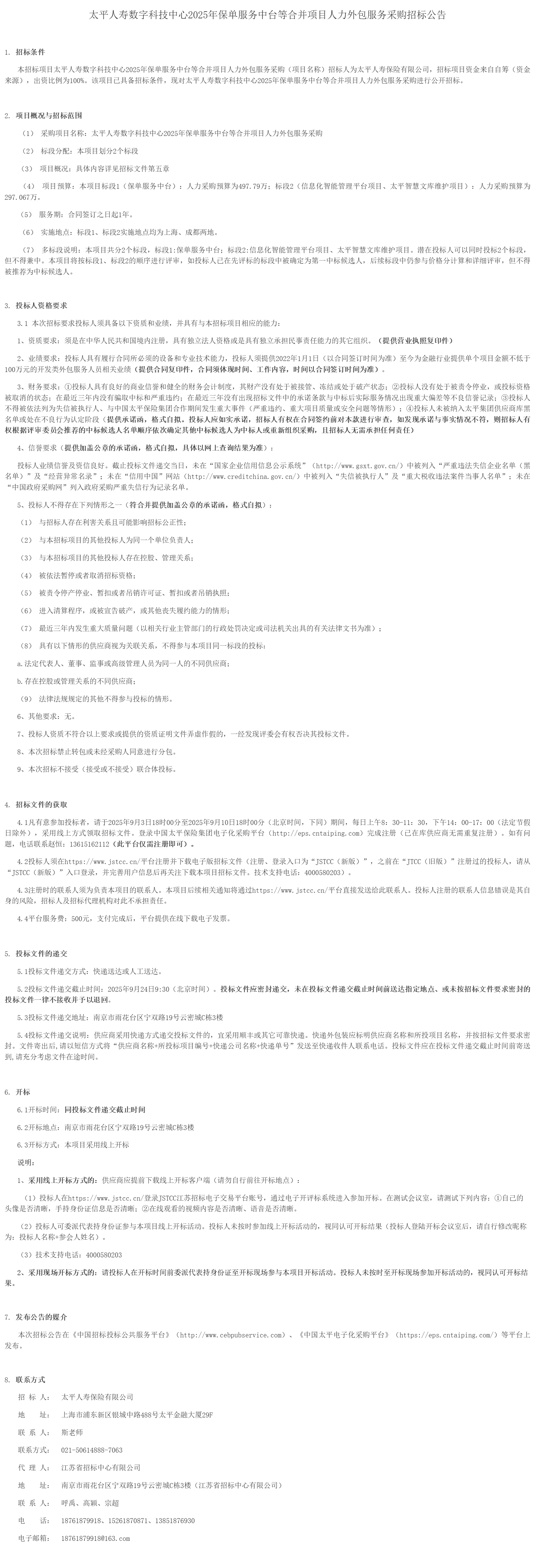 太平人寿数字科技中心****年保单服务中台等合并项目人力外包服务采购招标公告