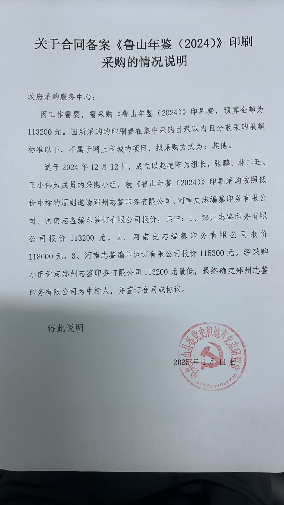 | 二、合同名称:《鲁山年鉴》(****)印刷费 | ||||||||||||
