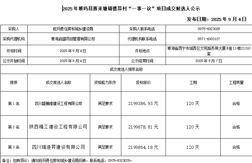 2025 年班玛县赛来塘镇德昂村“一事一议”项目中标候选人公示