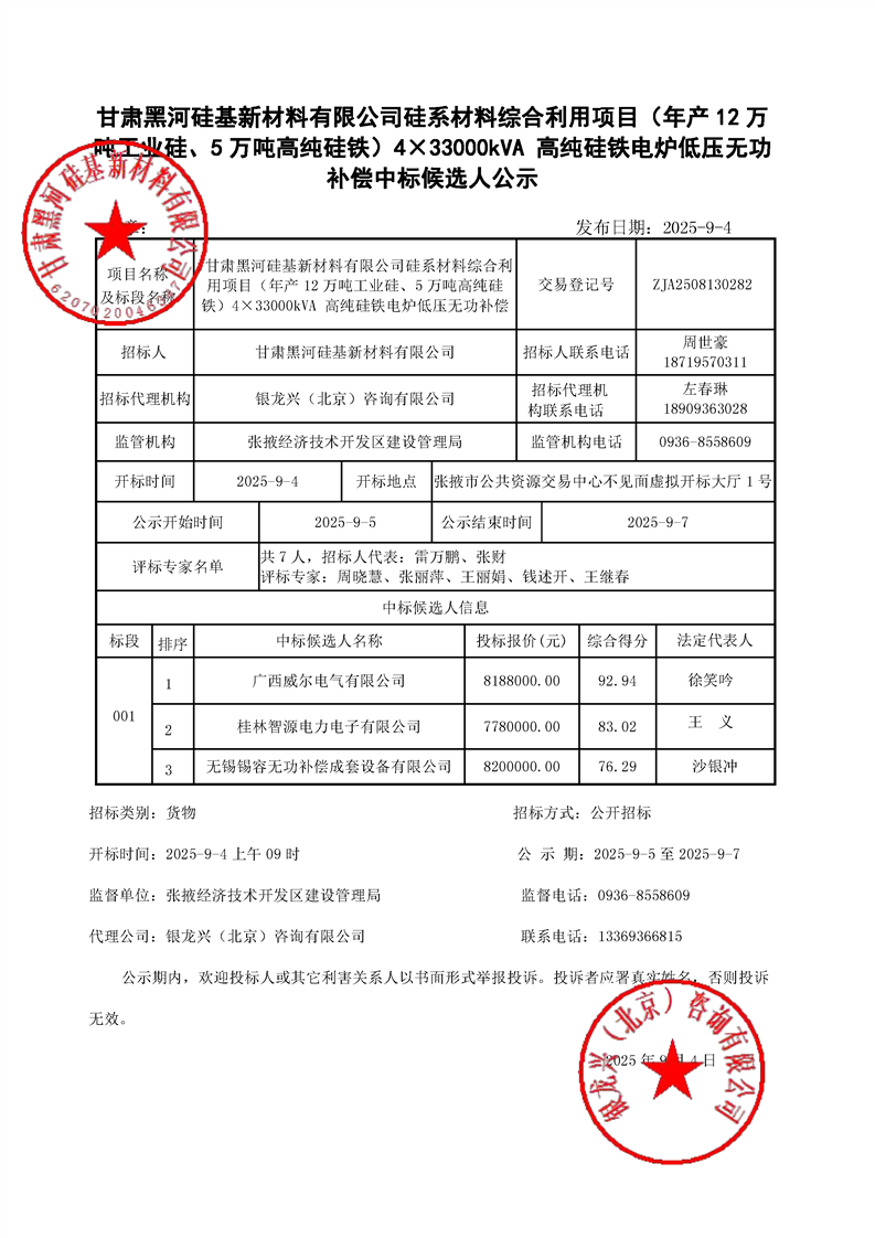 [市本级]甘肃黑河硅基新材料有限公司硅系材料综合利用项目(年产12万吨工业硅、5万吨高纯硅铁)4×33000kVA 高纯硅铁电炉低压无功补偿中标候选人公示
