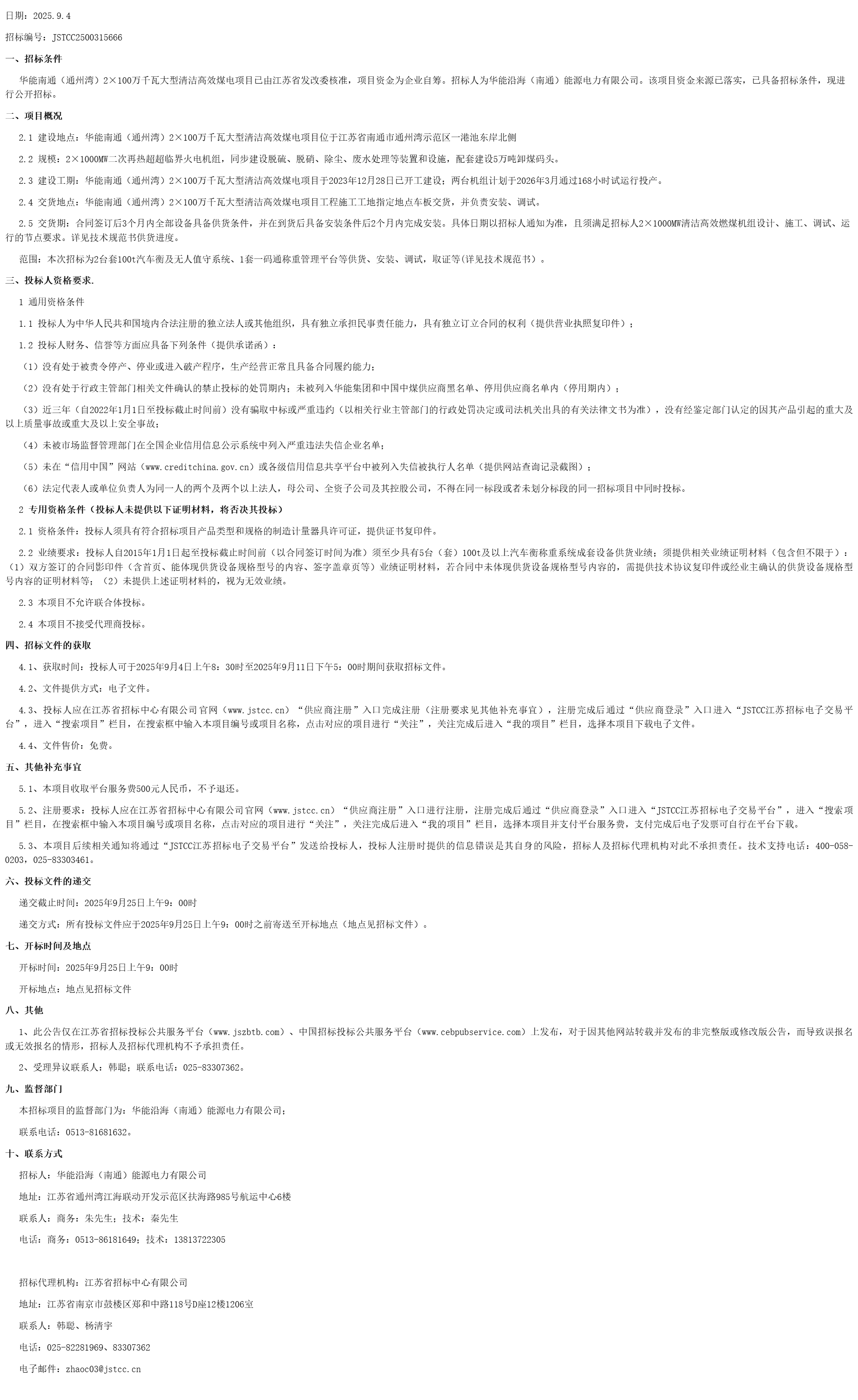 华能南通(通州湾)*×***万千瓦大型清洁高效煤电项目已由江苏省发改委核准,项目资金为企业自筹。招标人为华能沿海(南通)能源电力有限公司。该项目资金来源已落实,已具备招标条件,现进行公开招标。