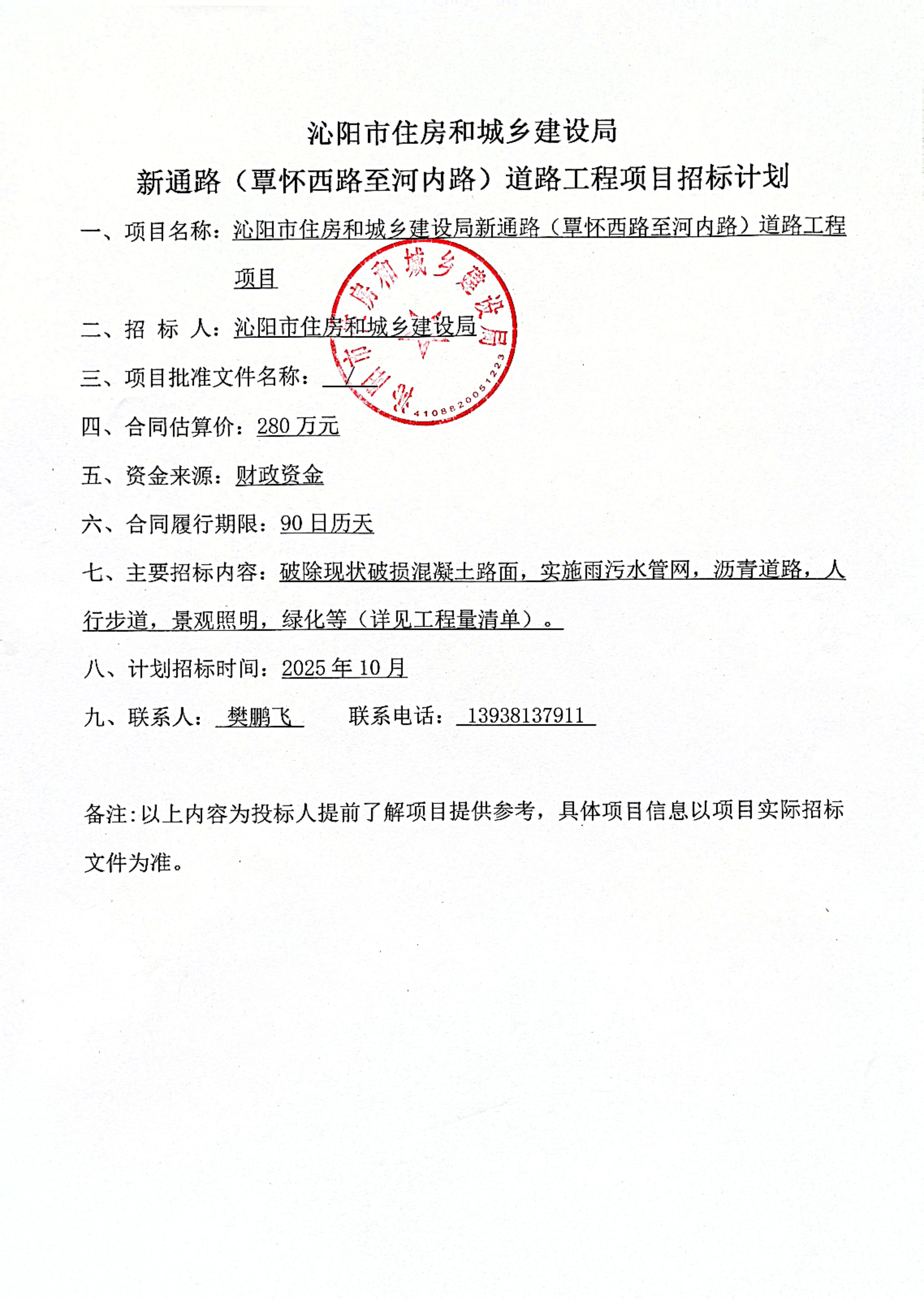 沁阳市住房和城乡建设局新通路(覃怀西路至河内路)道路工程项目招标计划