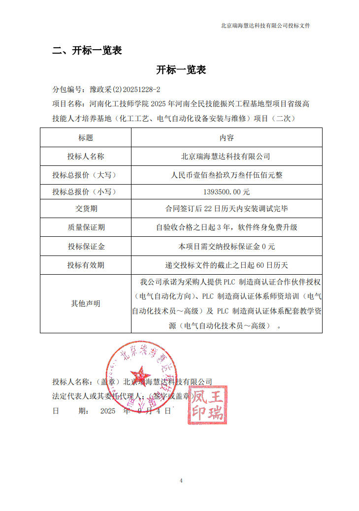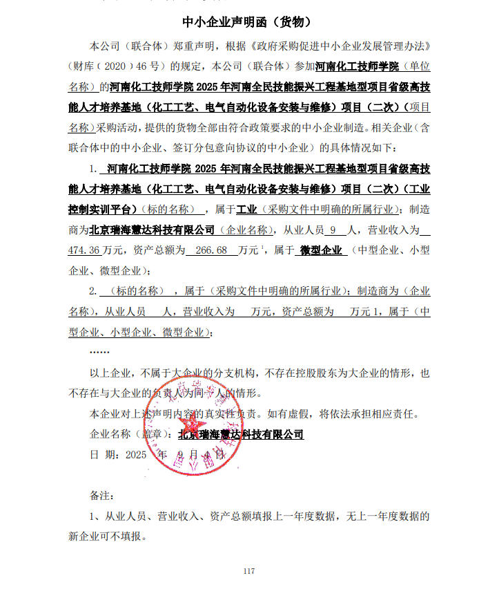 河南化工技师学院2025年河南全民技能振兴工程基地型项目省级高技能人才培养基地(化工工艺、电气自动化设备安装与维修)项目(二次)-中标公告