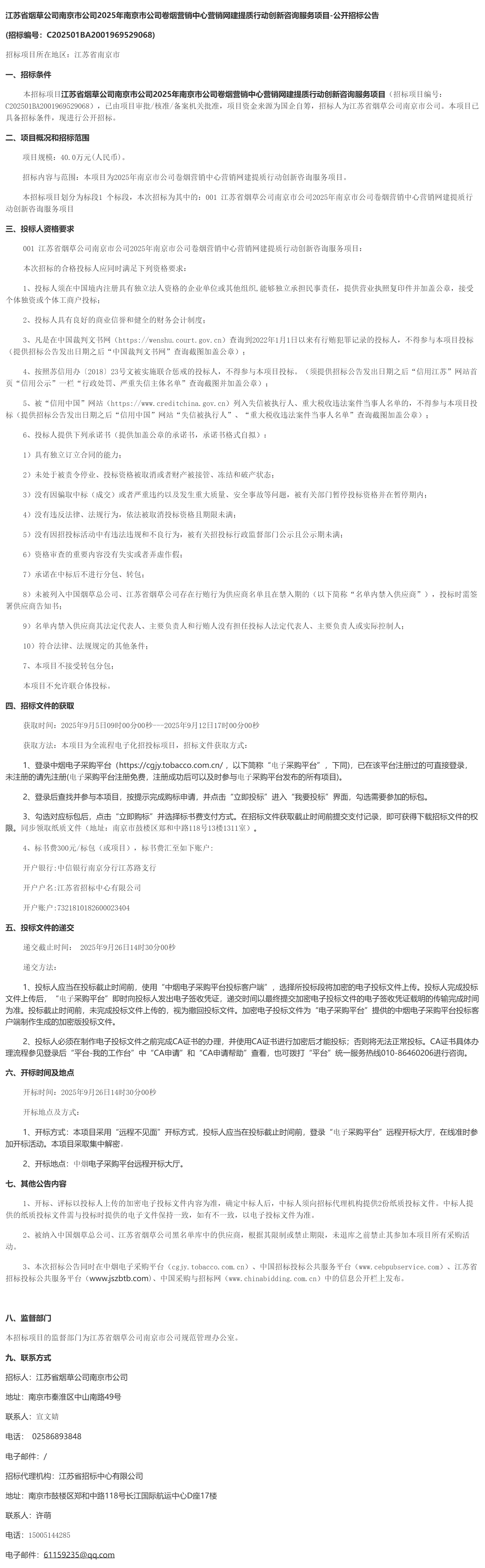 江苏省烟草公司南京市公司****年南京市公司卷烟营销中心营销网建提质行动创新咨询服务项目招标公告