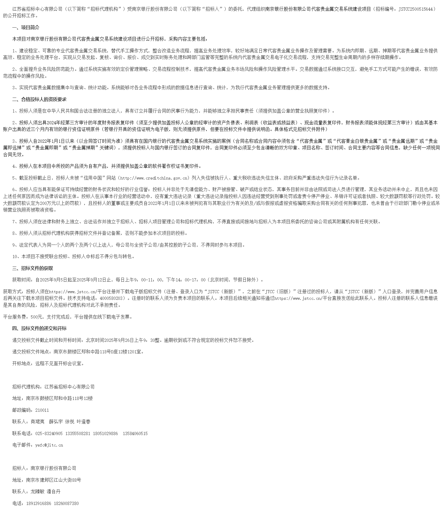 江苏省招标中心有限公司(以下简称“招标代理机构”)受南京银行股份有限公司(以下简称“招标人”)的委托,代理组织南京银行股份有限公司代客贵金属交易系统建设项目(招标编号:***************)的公开招标工作。