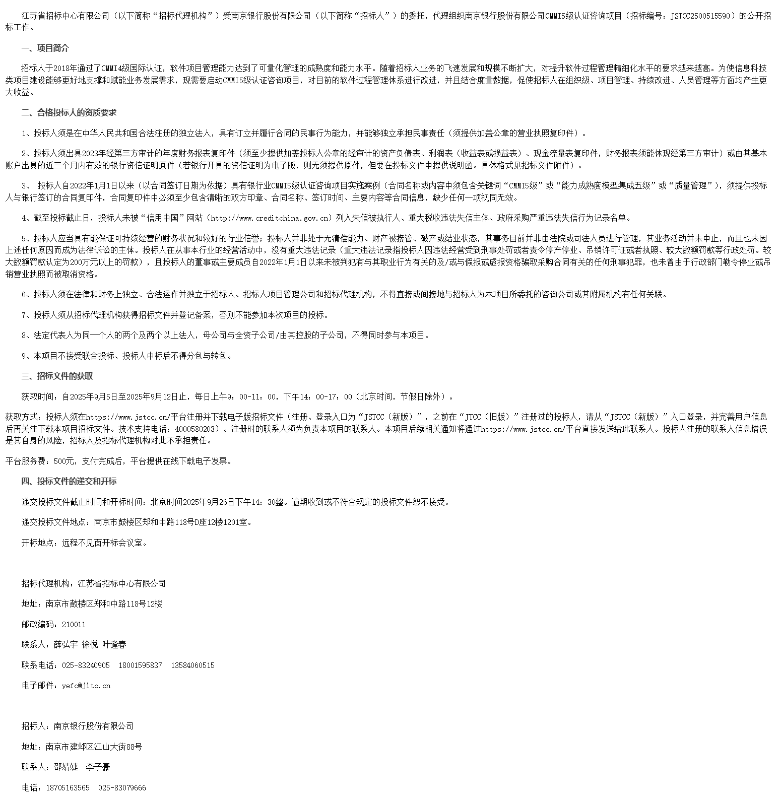 江苏省招标中心有限公司(以下简称“招标代理机构”)受南京银行股份有限公司(以下简称“招标人”)的委托,代理组织南京银行股份有限公司*****级认证咨询项目(招标编号:***************)的公开招标工作。