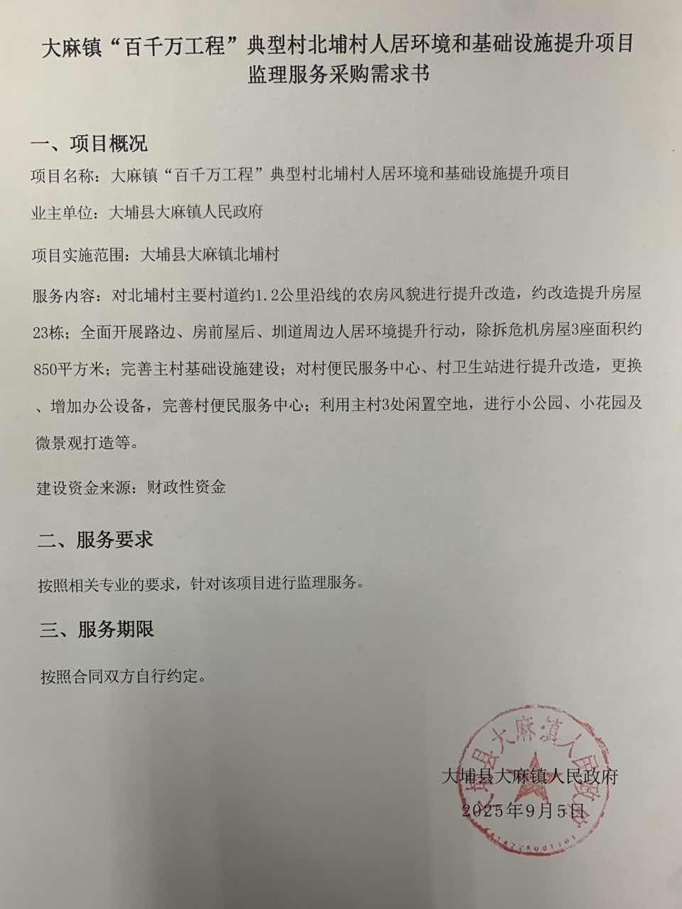 大麻镇“百千万工程”典型村北埔村人居环境和基础设施提升项目监理服务采购公告