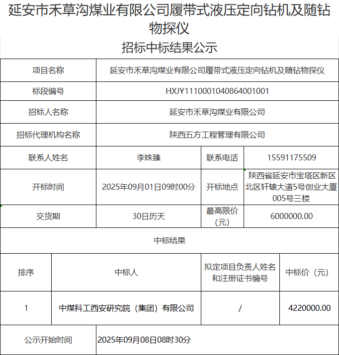 延安市禾草沟煤业有限公司履带式液压定向钻机及随钻物探仪中标结果公示