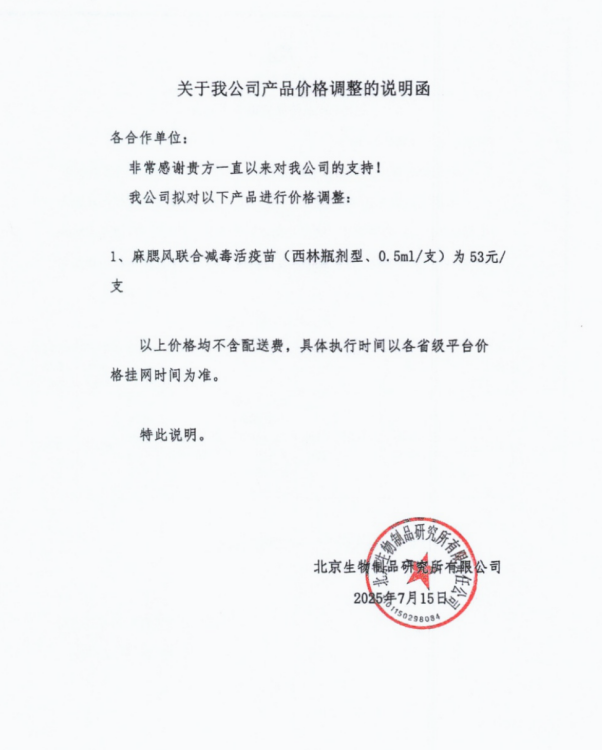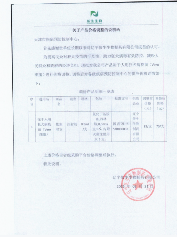 接到辽宁依生生物制药有限公司、北京生物制品研究所有限公司部分疫苗价格调整的通知,现将调整后的价格进行公示,执行时间自挂网之日起。
