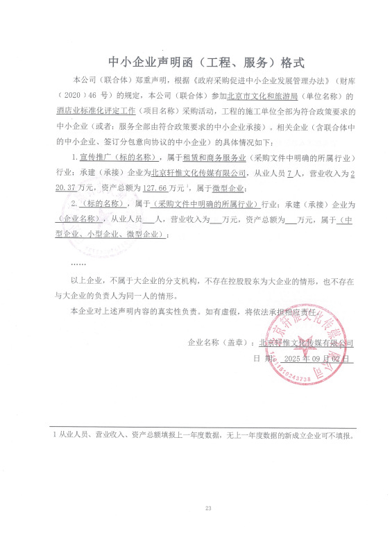 | 北京轩惟文化传媒有限公司 | * | **.***万元 | **.***万元 | 为进一步加强对全市酒店的宣传推广,不断提升酒店行业整体形象,打造酒店品牌,提升酒店消费吸引力,助理酒店行业高质量发展,现拟开展酒店行业宣传推广项目。本项目以重要节假日为时间结点,通过制作宣传手册、拍摄宣传视频、编制宣传文案等方式,制定并实施全方位、多层次的宣传推广策略,加强对标准化酒店以及全市纳统酒店的宣传。自合同签订之日起至****年**月**日止。具体详见招标文件。 |