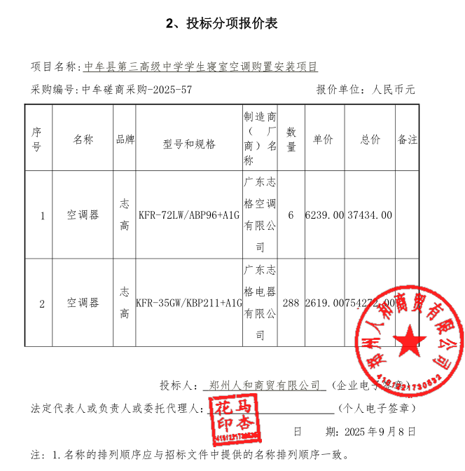 中牟县第三高级中学学生寝室空调购置安装项目-成交公告