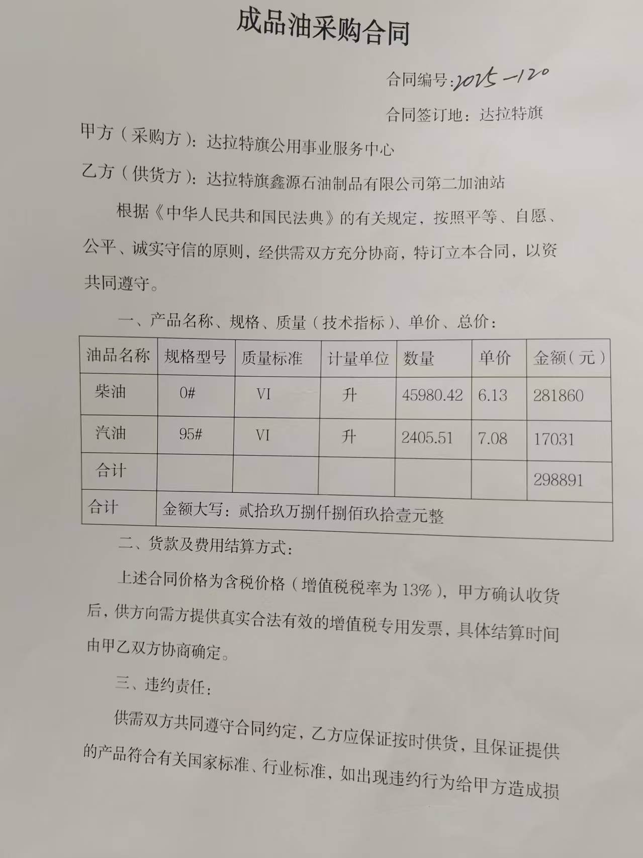 达拉特旗公用事业服务中心成品油采购合同政府采购合同公告