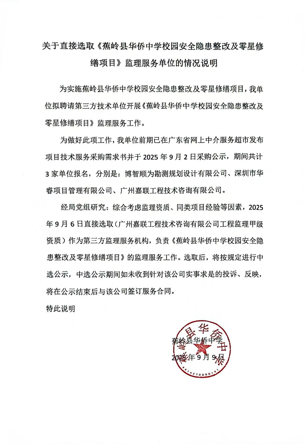 关于【蕉岭县华侨中学校园安全隐患整改及零星修缮项目】中选结果的公告