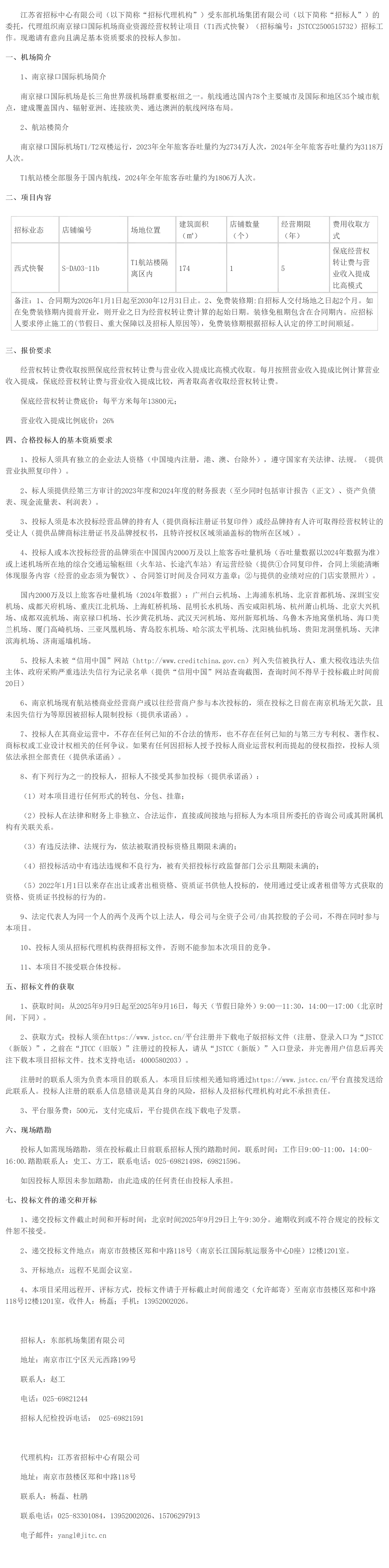 南京禄口国际机场商业资源经营权转让项目(**西式快餐)招标公告