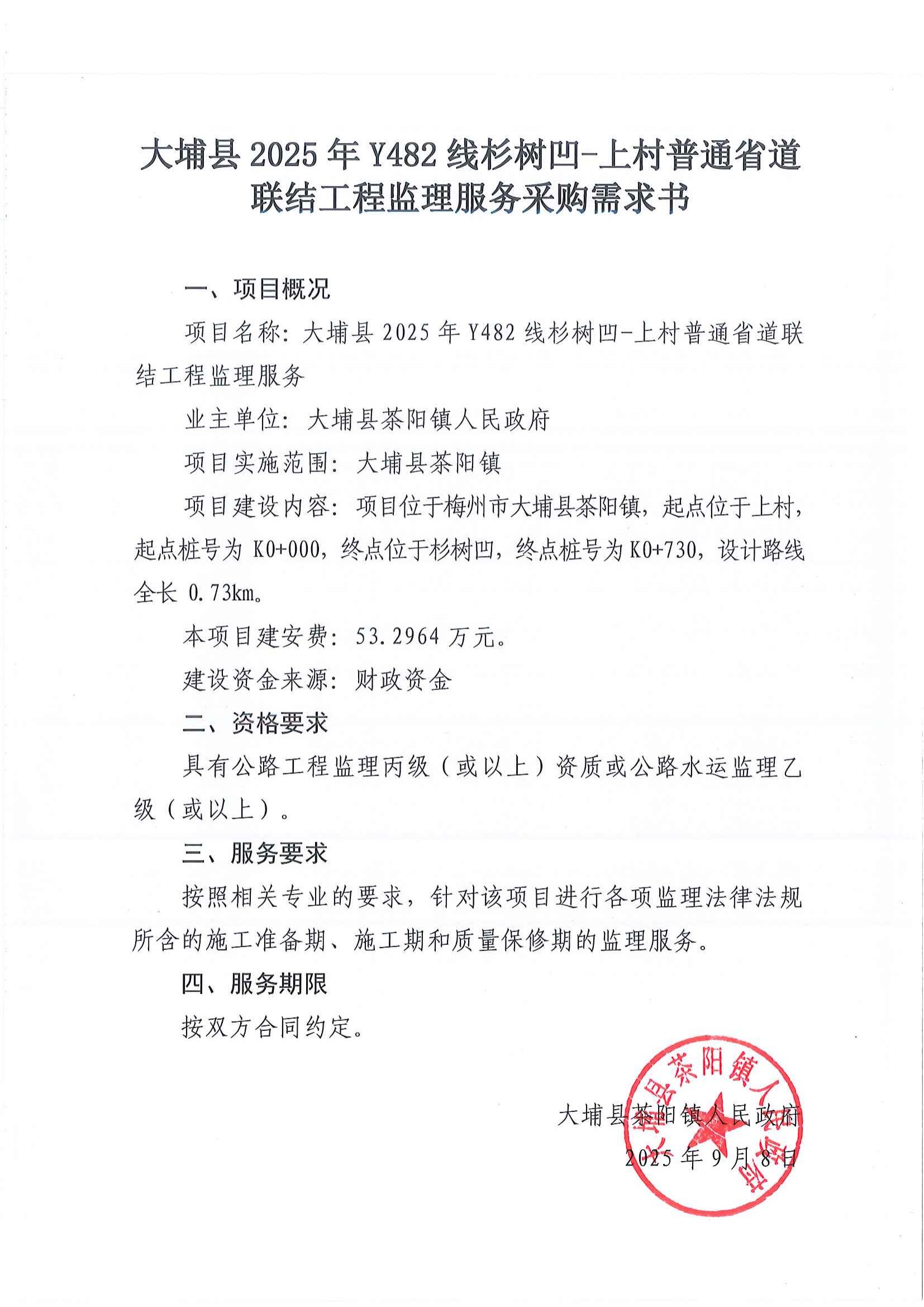 大埔县2025年Y482线衫树凹-上村普通省道联结工程采购公告