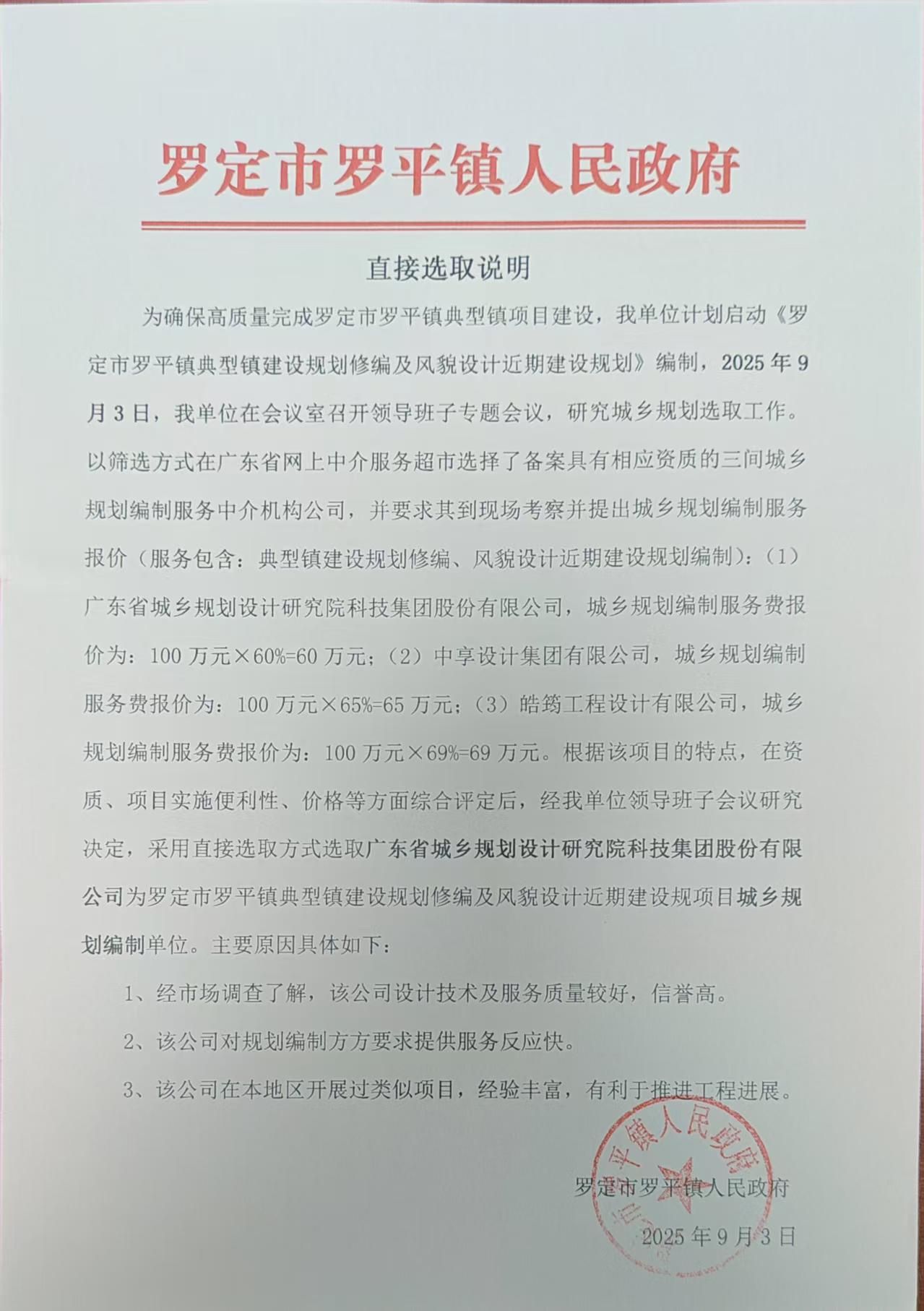 关于【罗定市罗平镇典型镇建设规划修编及风貌设计近期建设规划】中选结果的公告